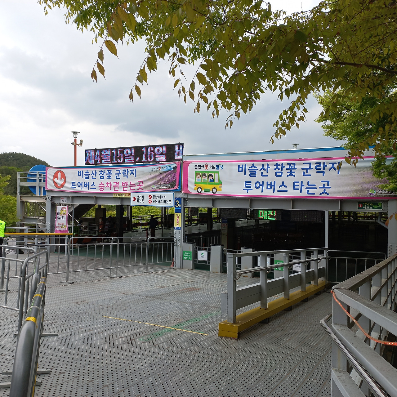 도보 등산 대신에 빡빡한 일정을 고려하여 ‘제27회 비슬산 참꽃 문화제’에서 비슬산 정상까지 운영하는 20인승 소형 셔틀버스를 탑승하여 정상까지 곡예를 하듯 산복도로를 이동하였다. 심한 회전구간에서는 차체의 등뼈가 부서지는 듯한 소리가 셔틀버스 바닥에서 났다. 12시경에 이미 2,000여 명 정도가 셔틀버스를 타고 산 정상에 올라간 것 같았다.(근거 : 나의 번호표 109조, 한조에 20명씩 타는 무료 셔틀버스 티켓) 총 버스 7대가 쉼 없이 계속 주차장과 정상을 순환하며 탐방객들을 실어 날랐다. 효율적인 관람객 수송 관리차원에서 축제 기간 중 전기버스는 운행 중단하고 있다고 했다.