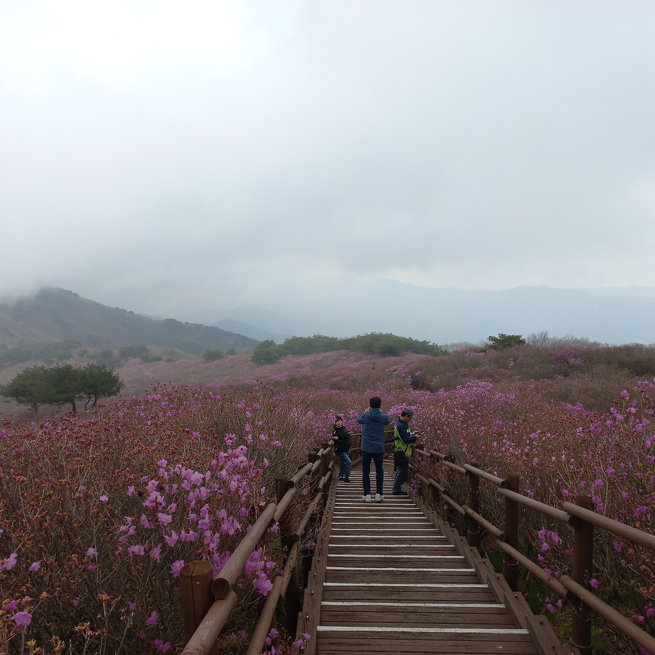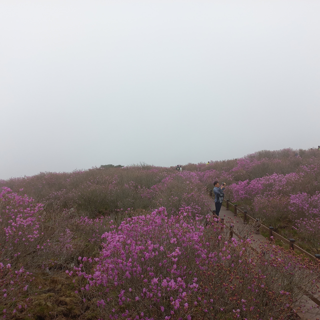 대견사(표고 1,000m) 입구에서 하차했다. 조금 전 하차한 탐방객과 관람을 끝내고 내려가려는 탐방객이 뒤엉켜 있었다. 진달래를 먼저 볼 것이냐 대견사를 먼저 들릴 것이냐로 실랑이를 하는 탐방객도 있었다. 나는 진달래를 택했다. 나의 꿈, 버킷리스트가 진달래였기 때문이다. 운무 속에서 진달래 군무사이에 난 데크를 따라 걷는, 신선이 된 기분이었다. 대곡역 600번 버스 정류장에서 사귄 동갑내기 서울 강북 아저씨를 군락지에서 다시 만났다. 반가웠다. 서로에게 사진을 찍어 주었다. 아저씨는 천왕봉으로 향하고 나는 대견사로 내려왔다. 우리는 그렇게 기약 없이 헤어졌다.(참고로 나도 아저씨군 임)
