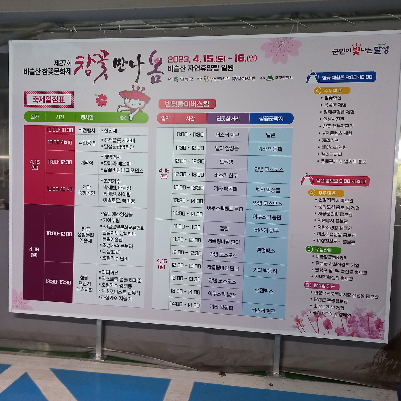 비슬산은 나에게 선녀 같은 신비로움과 가슴 설렘으로 남아 있었다. 오늘(2023.04.15. 토. 흐림/가끔 비) 아침 07:00 수서역에서 출발하여 동대구역에 08:41 도착하였다. 지하철 1호선을 이용하여 동대구역에서 승차, 대곡역에서 하차하였다. 대곡역이 비슬산 휴양림 가는 출발 정류장이기 때문이다. 대곡역 버스 정류장에는 비슬산행 600번 임시운행 버스를 타기 위하여 30명 정도의 등산객들이 모여 있었다. 휴양림 주차장에 11:30 하차하였다.