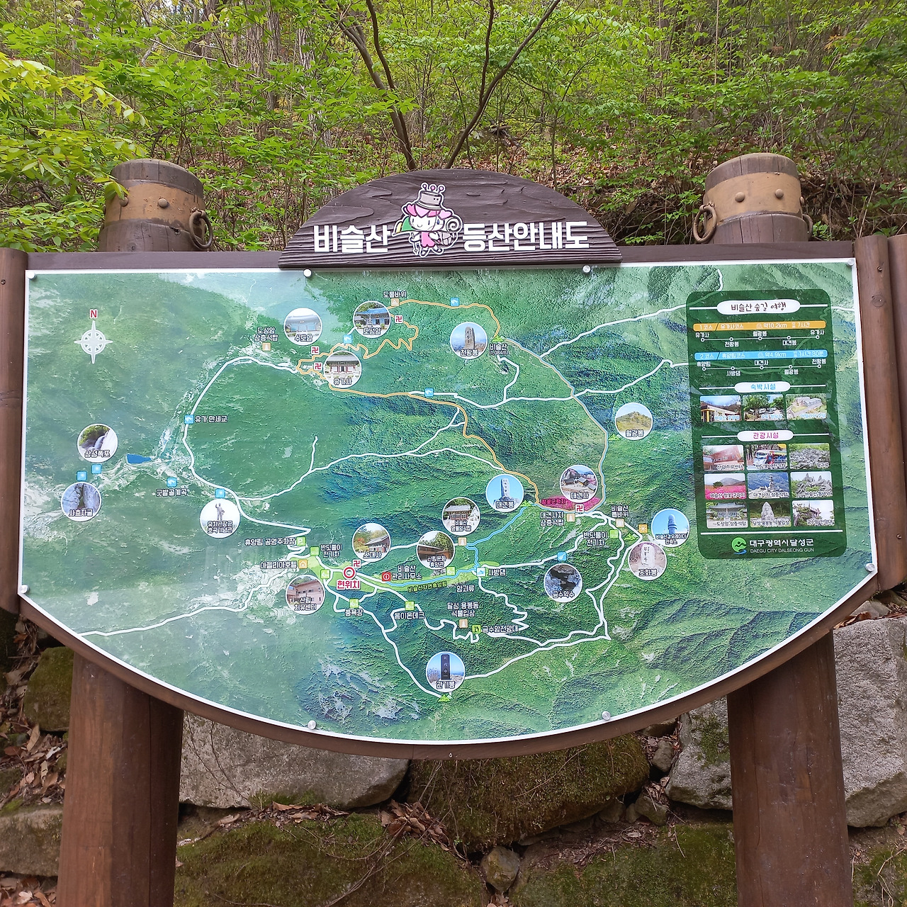 비슬산 자연 휴양림 주차장->참꽃 군락지(고위평탄면)->대견사(일연)->암괴류(토르, 애추)-> 비슬산 자연휴양림/펜션->소재사->비슬산 자연 휴양림 주차장