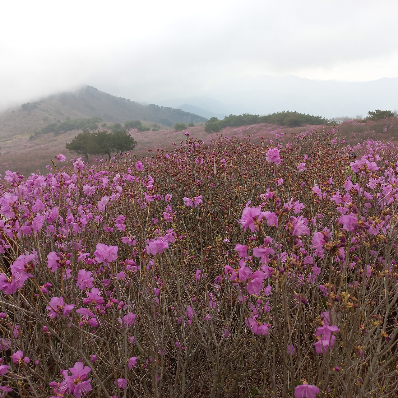 다행히 산 정상 진달래 군락지의 진달래는 잠깐의 저온을 견디어 낸 다른 가지에서 새로운 꽃을 피워내어 참꽃의 진수를 보여 주었다. 참꽃 군락지에 들어서자 구름과 안개가 끼어 군락지 건너편 천왕봉까지 멀리 볼 수는 없었다. 일기예보대로 간간이 비가 후드득 뿌려 등산객들이 우산을 펼치거나 비옷을 찾아 입었다. 30만 평 고위 평탄면에 이미 핀 일부 진달래는 냉해를 입어 시들어 가고 있었다. 나머지 새로운 보랏빛 진달래군은 바람에 흔들리며 신비로운 모습으로 나에게 다가왔다. 군락군의 참꽃이 만개하였다.