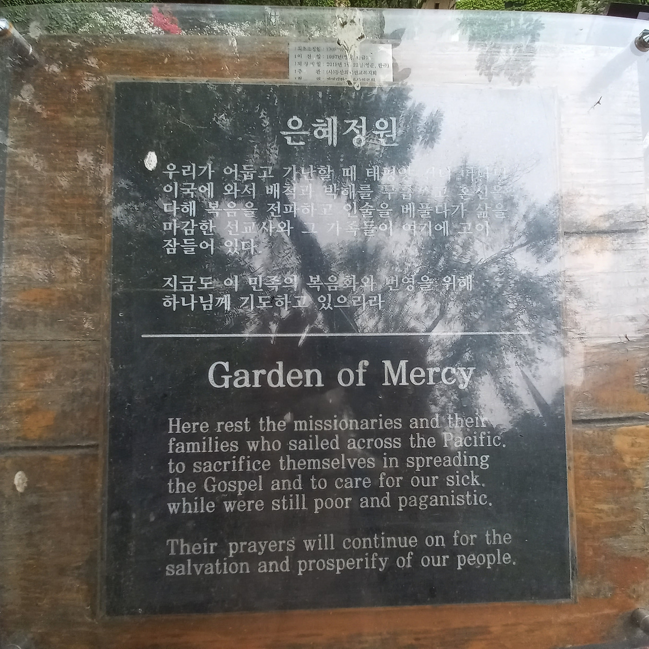 외국인 선교사들과 그 가족들의 묘지이다. 묻힌 사람 중에 생후 1년 남짓한 아기가 5명이나 된다고 한다. 당시 열악한 의료 상황이 주요 원인이라고 추정한다. 비석의 내용은 이렇다. “우리가 어둡고 가난할 때 태평양 건너 머나먼 이국에 와서 배척과 박해를 무릅쓰고 혼신을 다해 복음을 전파하고 인술을 베풀다가 생을 마감한 선교사와 그 가족들이 여기 잠들어 있다.” 숙연해진다.