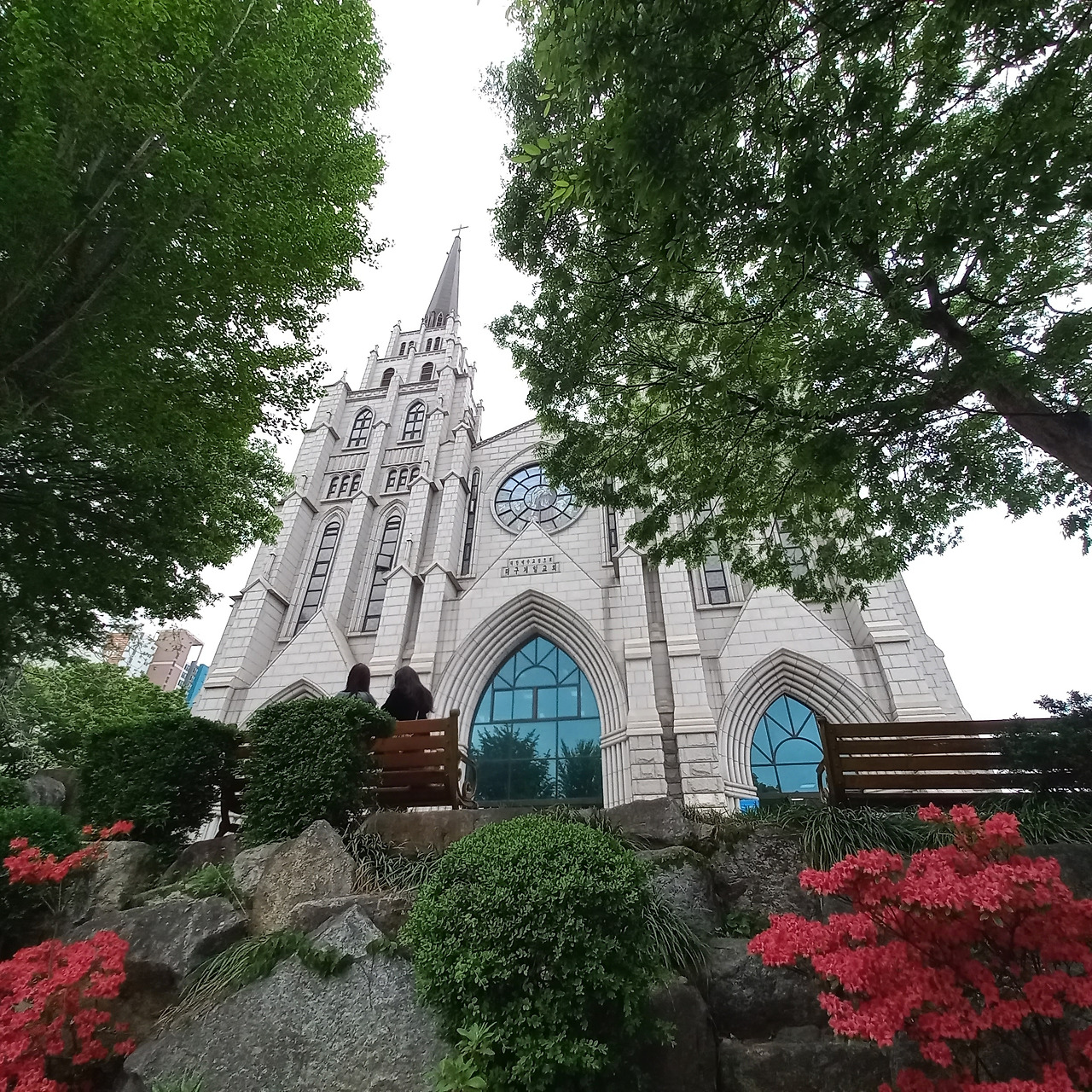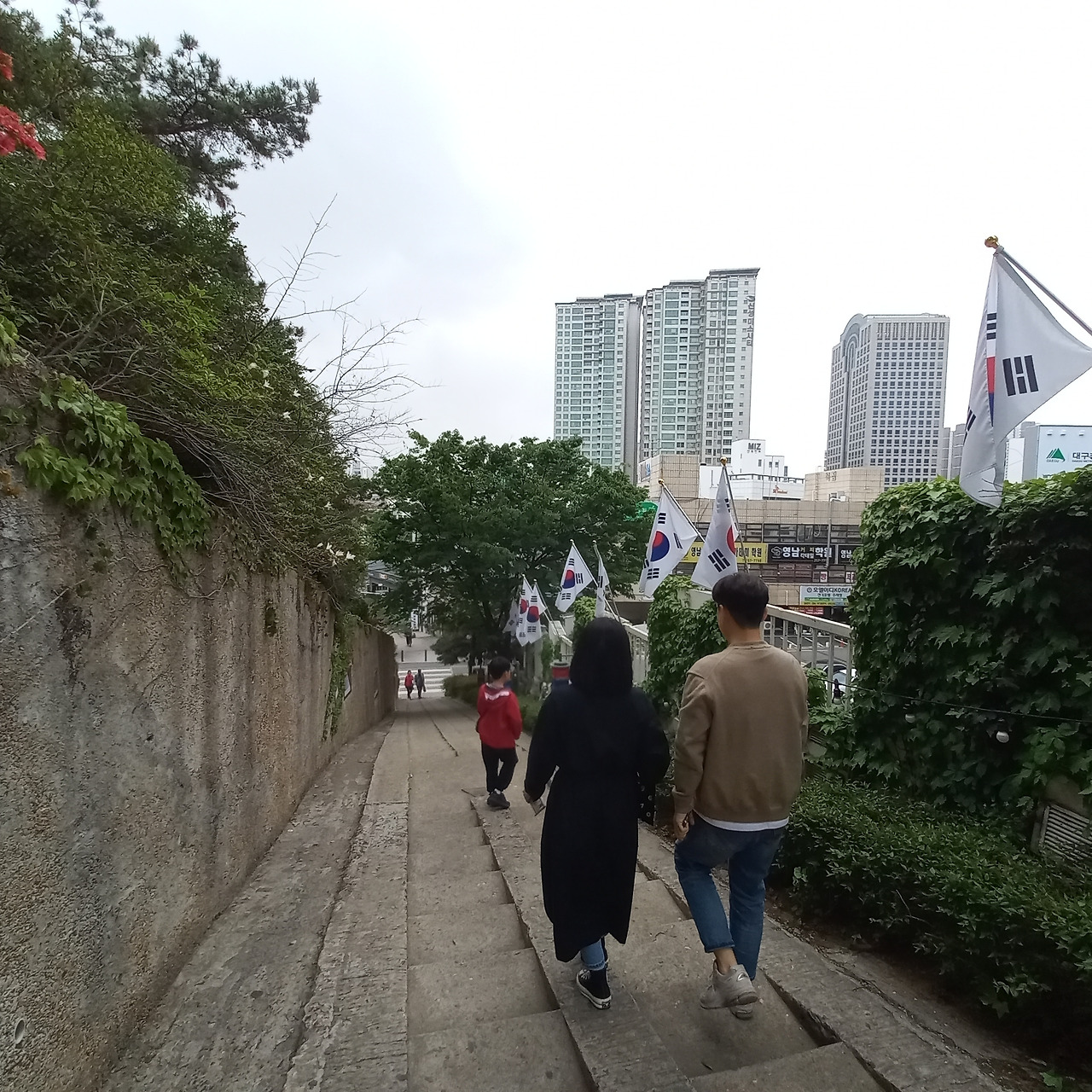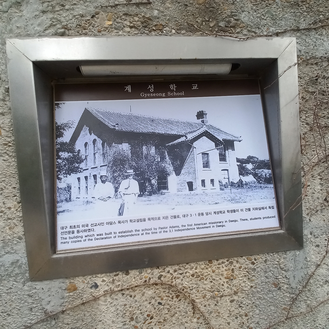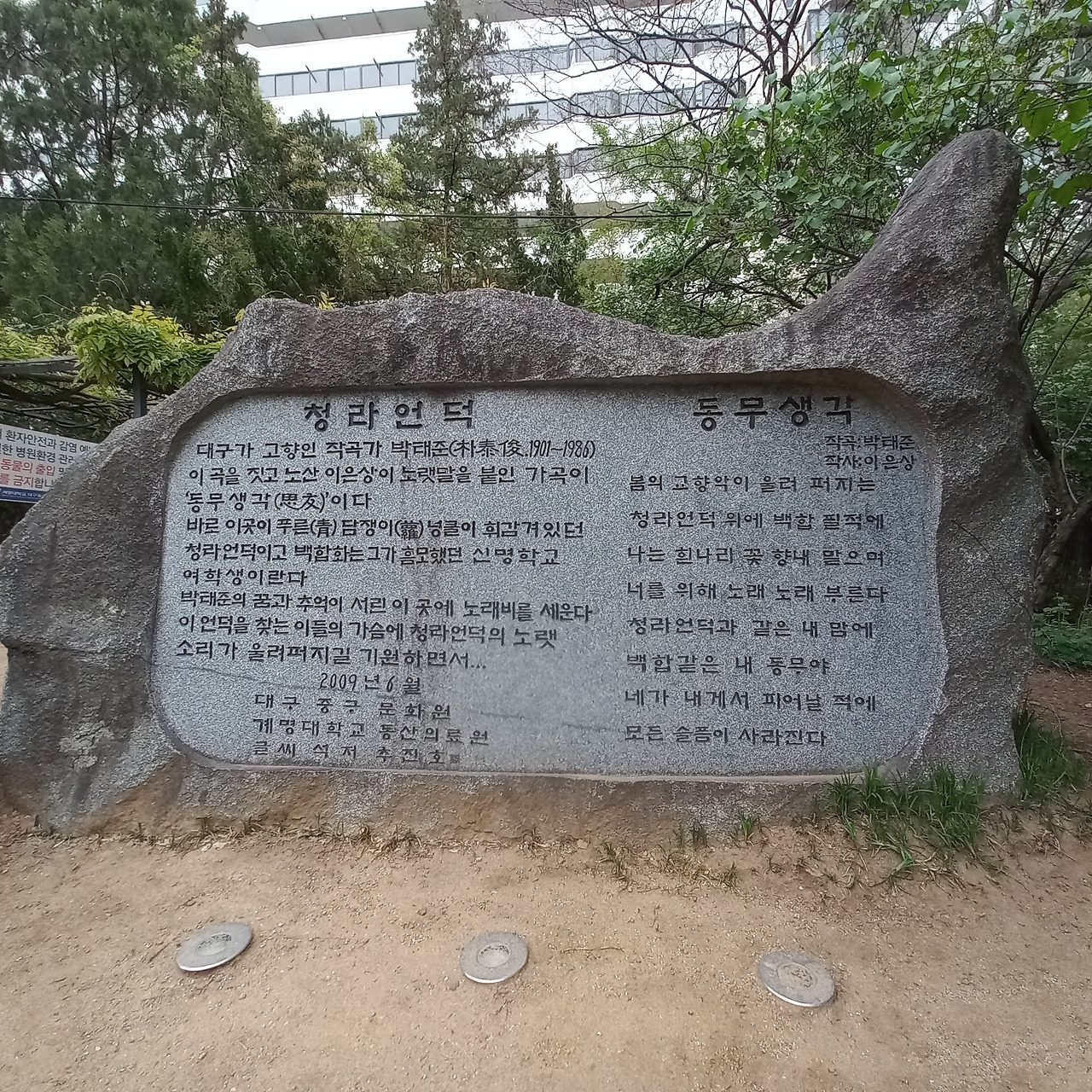 오늘(2023.04.16. 일. 흐림) 오전에 대구 앞산공원을 탐방하고, 오후에 대구 도시철도3호선을 타고 청라언덕(신남) 역에서 하차했다. 계산오거리 180m 전에서 좌측 골목으로 조금 올라 가면 청라언덕이 나온다. 계명대 동산병원 남문 앞 청라언덕 진입로에 들어섰을 때 마침 계산오거리에서 자전거바퀴를 굴리며 올라오고 있는 여학생이 보였다. 핸들 바구니에는 책가방이 담겨 있었다.동무생각의 백합 같은 그 친구의 후예인 것이 분명해 보였다.