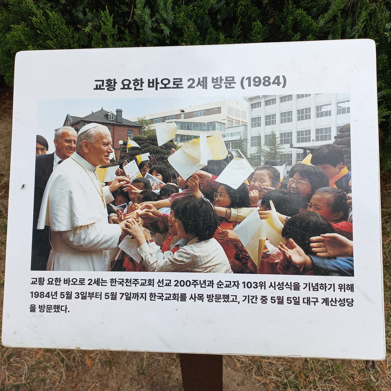 1984년 5월 3일부터 5월 7일까지 교황 요한 바오로 2세는 한국천주교회 선교 200주년과 순교자 103위 시성식을 위하여 한국 교회를 방문하였다. 그기간 중 5월 5일 계산 성당을 방문하였다.