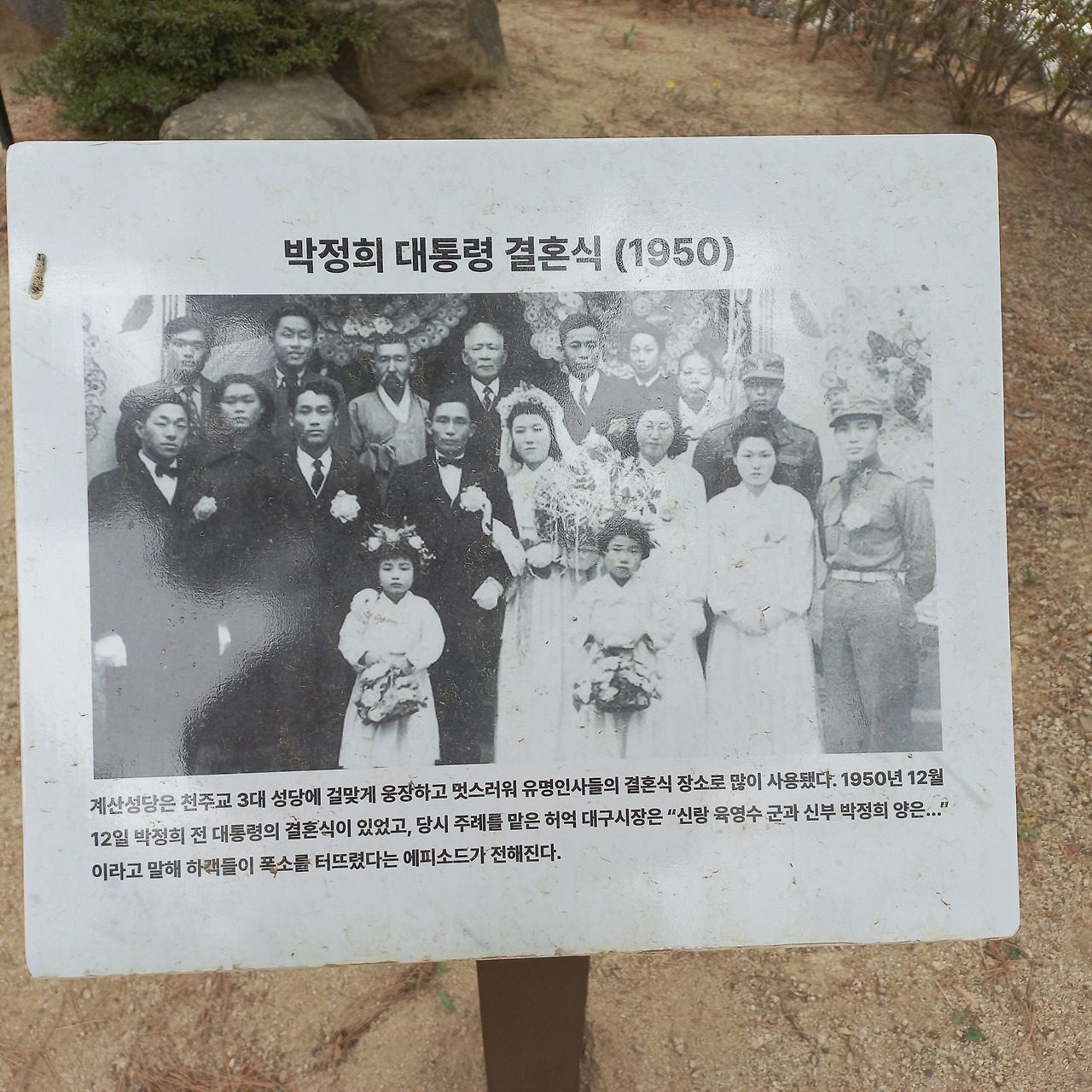 박정희 전 대한민국 대통령과 육영수 여사가 1950년 12월 12일6.25 전쟁 중에 결혼식을 올린 장소이기도 하다. 결혼식 주례를 보던 대구시장 허 억(許億)이 신랑 육영수 군, 신부 박정희 양이라고 소개한 일화의 그 장소이다. 두 사람 모두 가톨릭 신자는 아니지만, 당시가 전쟁 중이라 마땅히 결혼식 장소가 없었던 탓에 성당에서 식을 올렸다고 한다. 제대 하단부 중앙에는 성 김대건 안드레아 신부의 유해(팔)가 안치되어 있다고 한다.