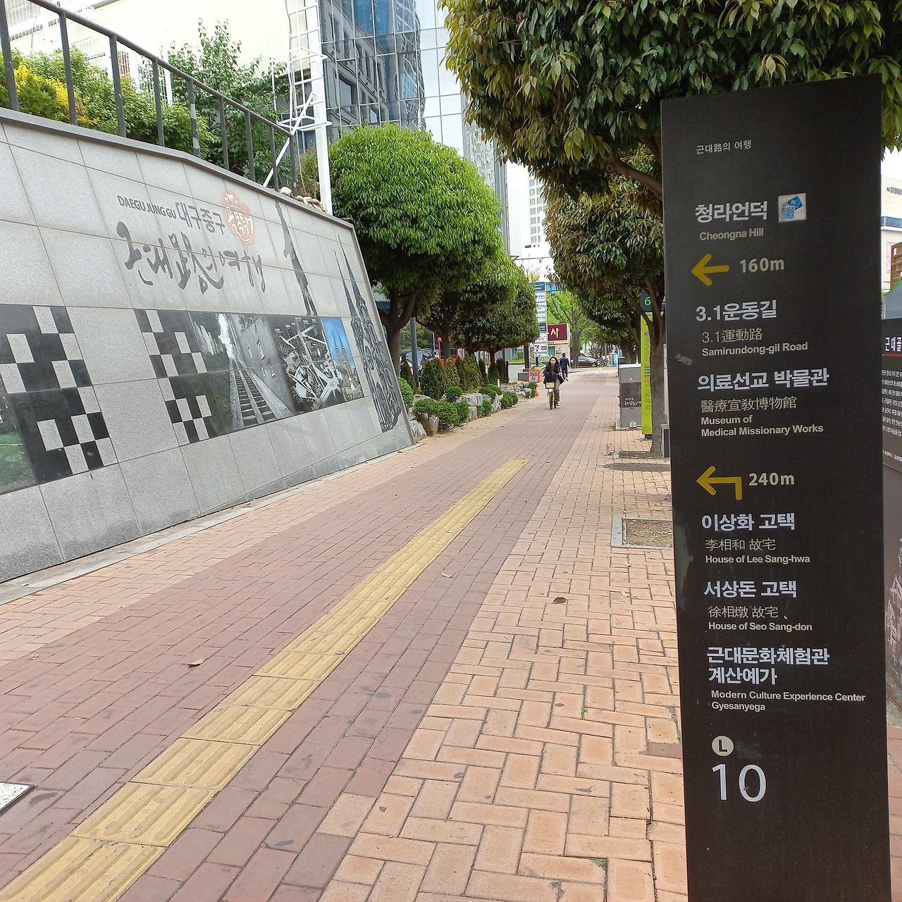 청라언덕(동무생각 노래 비)>미국 선교사 주택(스윗즈 주택, 챔니스 주택, 블레어 주택)> 선교사 무덤(은혜 정원)>대구 제일교회>3.1 만세운동길> 계산성당> 민족시인 이상화 고택> 국채보상운동 서상돈 선생 고택
