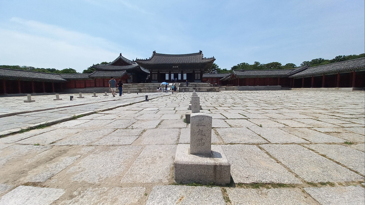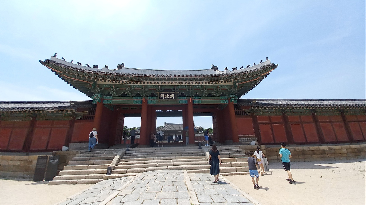 친구들과의 정기 저녁 모임(2023.06.17. 토, 맑음, 불볕 폭염) 전에 전번 달 창덕궁 탐방에 이어 못다 둘러본 창경궁과 종묘를 둘러보기로 했다. 안국역에서 나와 창덕궁 앞을 지나 터널 위의 언덕을 넘어갔다. 우측(남측)에는 종묘가 담장을 별도로 하여 인접해 있다. 향후 창덕궁과 종묘를 일괄 관람할 수 있게 연결할 예정이라고 한다. 언덕에서 조경작업을 하고 있는 직원 분에게 창경궁 정문위치를 물어 보어 보았다. 조금 더 걸어가면 엘리베이터가 나오는데 그것을 타고 지상으로 내려가서, 사거리에서 좌측으로 담 따라 올라가라고 하셨다. 정문(홍화문)이 동쪽에 있다. 자세히 설명하는 이유는 창덕궁방향에서 도보로 이동시 창경궁 이정표를 발견하지 못하였다. 거의 유일한 길이다.
