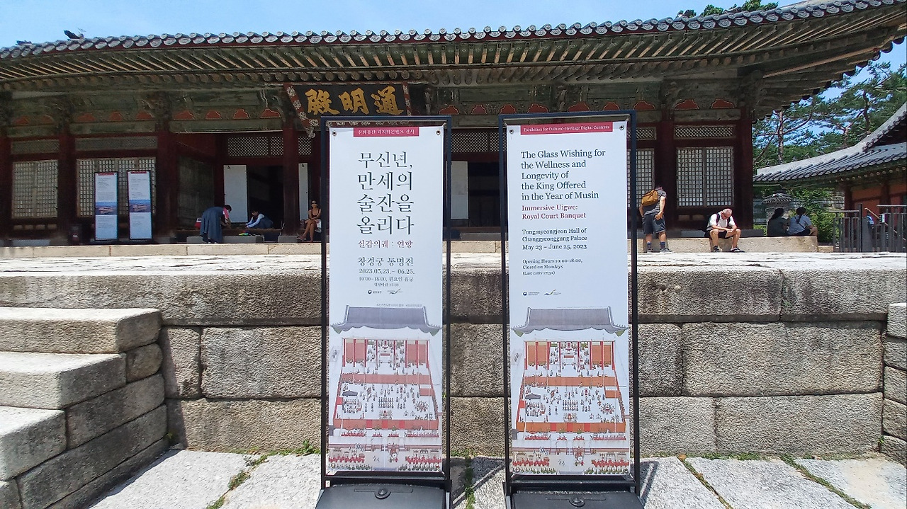 마침 “무신년, 만세의 술잔을 올리다 “라는 1848년(헌종 14년) 왕실 잔치 기록물 전시회(2023.05.23.~06.25)가 열리고 있었다. 신발을 벗고 들어가서 순원왕후 육순(60세)과 신정왕후의 망오(41세) 축하연 영상 기록물을 감상했다. 안내직원들이 친절하게 안내했고, 외국어 버전도 있어 외국인들이 많이 보였다.