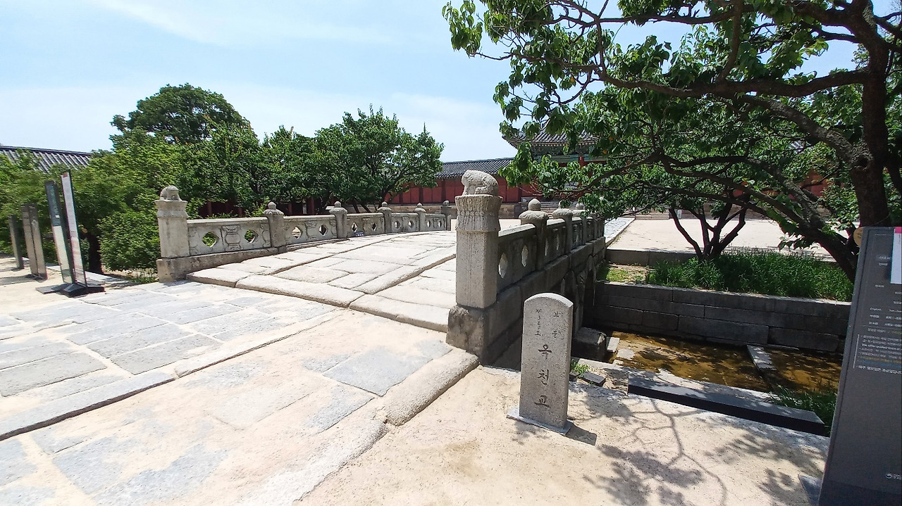 응봉산의 명당수가 창덕궁의 존덕정을 지나 창경궁의 북쪽 춘당지를 거쳐 옥천교로 흘러 남쪽으로 흘러간다. 다리 양쪽 아래에 무지개 모양 사이에는 도깨비 얼굴의 귀면이 조각되어 있는데, 귀신을 쫓아내어 궁궐을 보호하고 수호하는 의미를 가지고 있다. 금천 주변에 살구나무에서 익어 떨어진 노란 열매에 눈길이 저절로 간다.