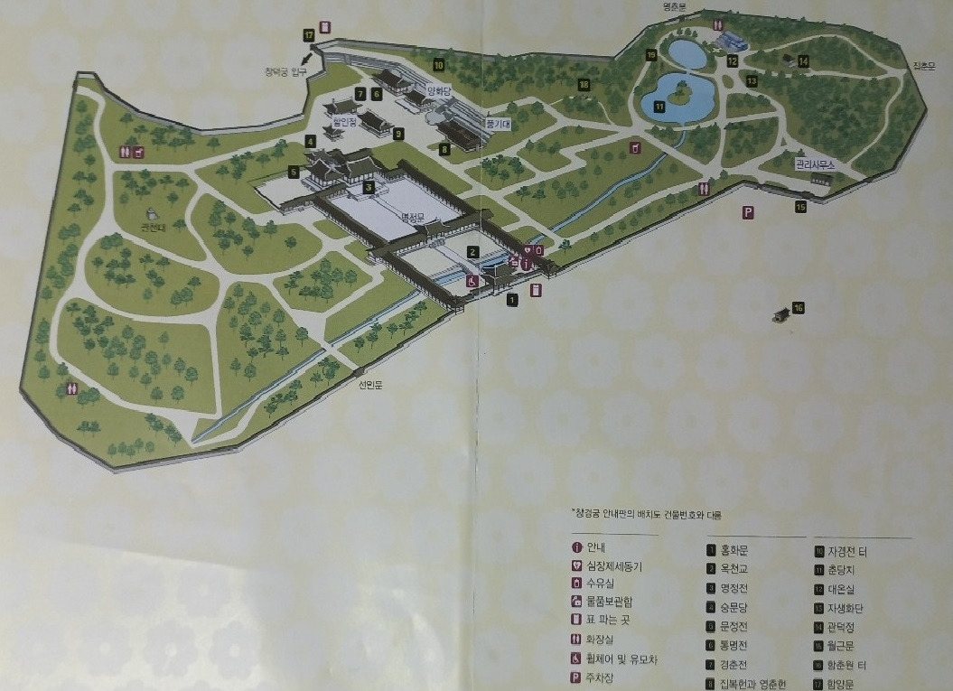 홍화문>옥천교>명정문>명정전>문정전>숭문당>빈양문>함인정>경춘전>환경전>통명전>양화당>영춘헌·집복헌>풍기대>성종대왕태실 및 성종대왕태실비>춘당지>팔각칠층석탑>대온실(식물원)>관덕정>관천대>선인문>함양문>창덕궁(후원) 입구>월근문