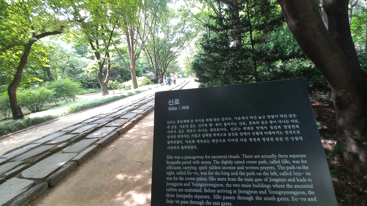 정문에서 정전 신문을 지나 영녕전 신문까지 하나의 길을 3개로 구획하여 중앙에는 신이 다니는 신향로를, 우측은 왕의 어로를, 좌측은 세자가 다니는 세자로를 조성하였다. 통로에 주의 표지판이 놓여 있다. "이곳의 가운데 길은 신로입니다. 보행을 자제하여 주시기 바랍니다."