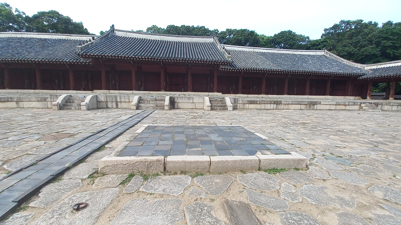 영녕 전 정면 (중앙 사각형 제단은 신위 모실 때 이곳에서 사전에 예를 올리는 장소, 그 후 영녕전에 영구 안치함) 좌우 익실 앞으로 동·서월랑이 뻗어 나와 ㄷ자 형태를 이루고 있고 박석을 덮은 상·하월대가 울타리를 가득 메우는 점도 정전과 동일하다.