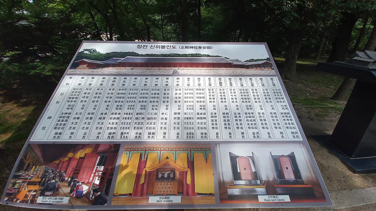 해설사님에 따르면 주요한 업적을 남긴 19명의 왕들은 정전에 모셨다. 단종 등 나머지 왕들과 태조 윗대 4조(목. 익. 도 환조)는 영녕전에 모셨다고 한다. 왕의 사후에 신하들의 천거가 없으면, 정전에 들지 못하고 영녕전으로 밀려났다고 한다. 정전에 드는 조건 및 잣대가 그만큼 엄격하였다고 한다.