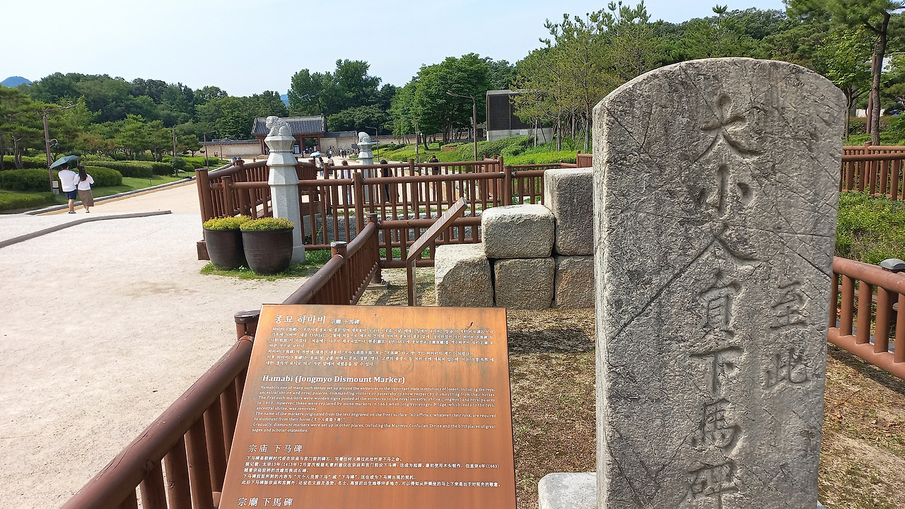 종묘 입구 정문밖에는 하마비(下馬碑)가 서 있다. 누구나 이곳을 지날 때에는 말에서 내리라는 명이 적힌 비석이다. 역대 왕들이 종묘를 왕래할 때 우물물을 마셨다는 종묘 어정(御井)이 하마비와 정문 중간쯤 우측에 있다.