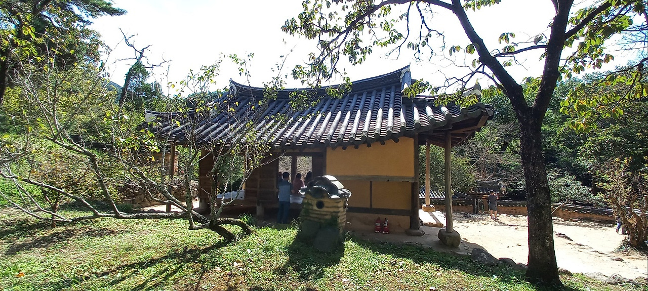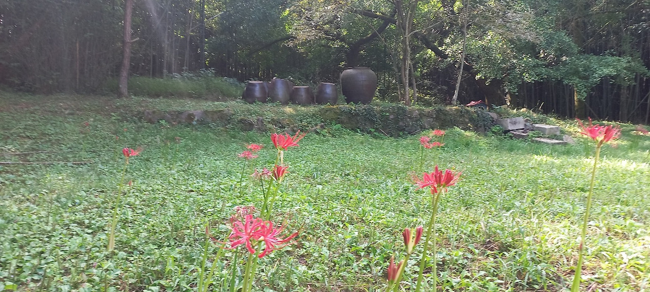 관리사 옆 마당에는 꽃무릇과 장독대가 조화를 잘 이루고 있다. 옆에 화장실이 있다.
