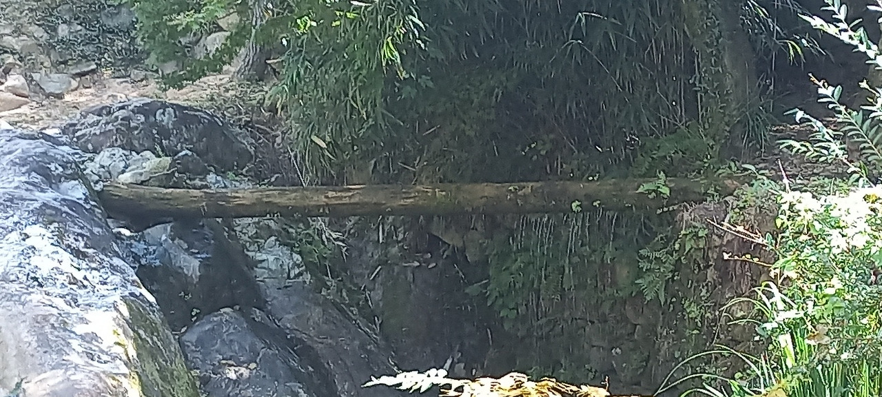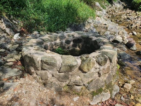 계곡을 가로질러 홈을 판 고목(刳木)으로 물길을 놓았다.