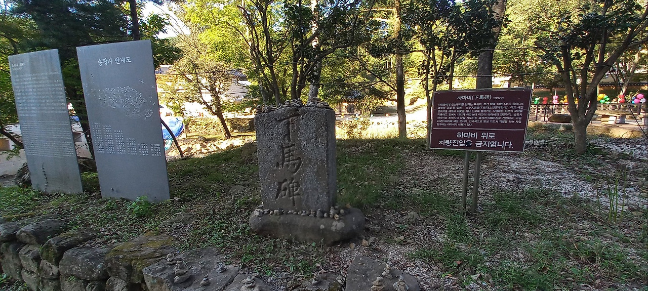 송광사 면적은 44,297㎡, 전남 순천시 송광면 송광사안길 100, 조계산 서쪽에 있다. 동쪽에 있는 선암사가 어머니 같은 온화하고 부드러운 산사라고 한다면, 송광사는 승보 사찰로서 아버지 같은 엄격한 기품이 느껴졌다. 산문을 지나니 하마비가 나를 기다리고 있었다. 송광사 국사 16분을 기념한 비림을 지나 일주문에 들어섰다.