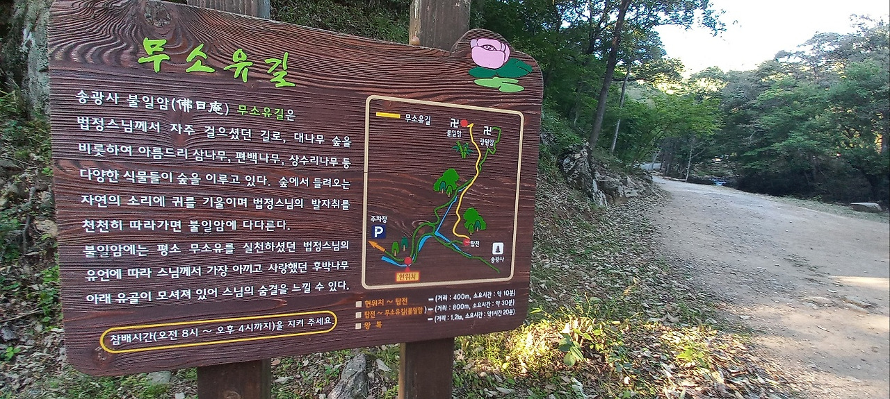 송광사입구로부터 도보 30분 거리 불일암에서 70년대 중반부터 90년대 초반까지 17년 생활했다. 여기에서 '무소유'를 시작으로 '산방한담', '물소리 바람소리'등 많은 책을 썼다고 한다. 생전에 오가던 이 길이 '무소유 길'로 이름 붙여져 있다. 그의 가르침이다. “무소유란 아무것도 갖지 않는 것이 아니라, 불필요한 것을 갖지 않는다"