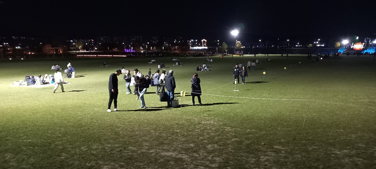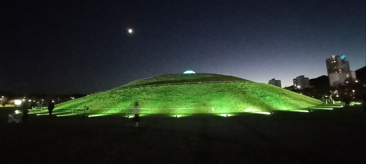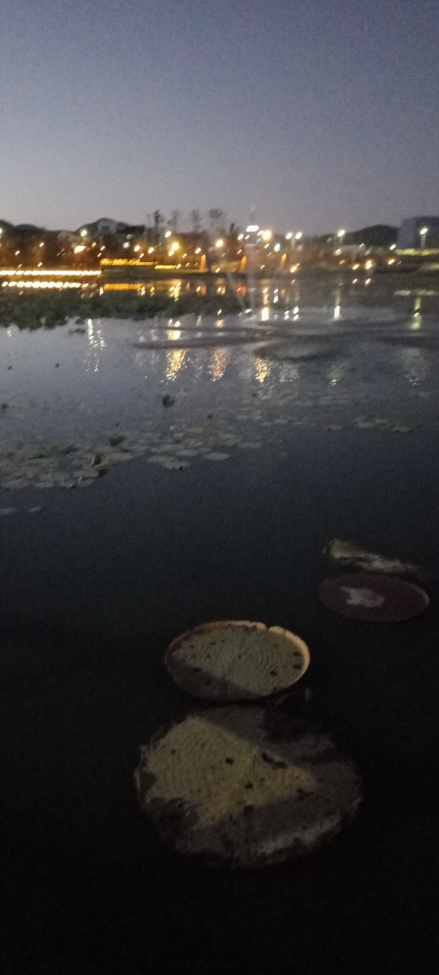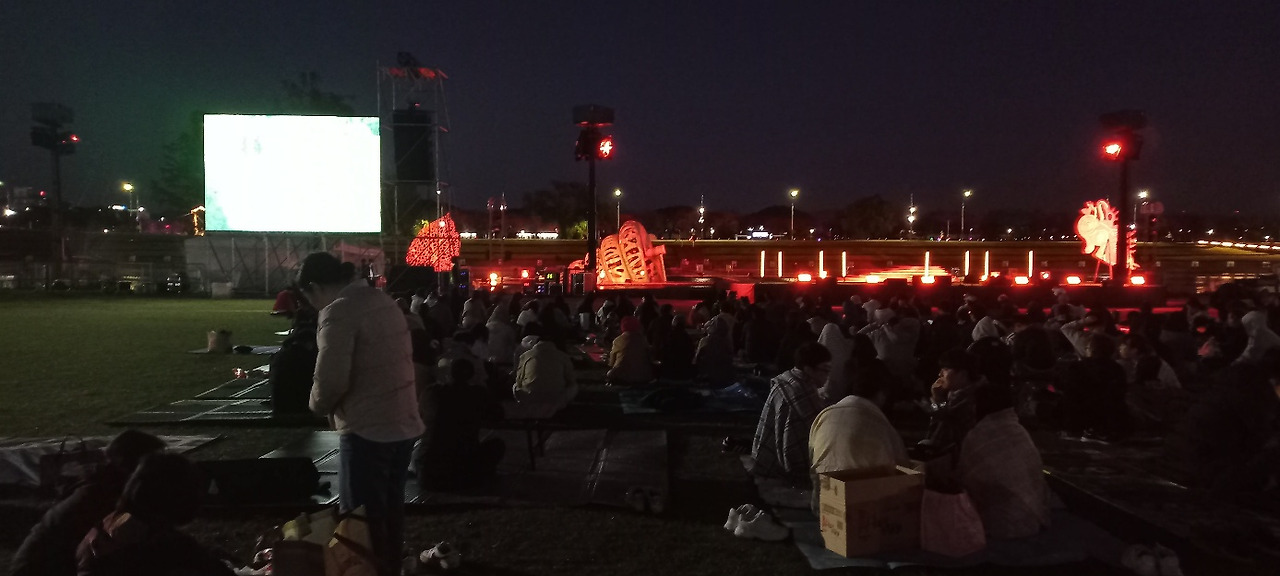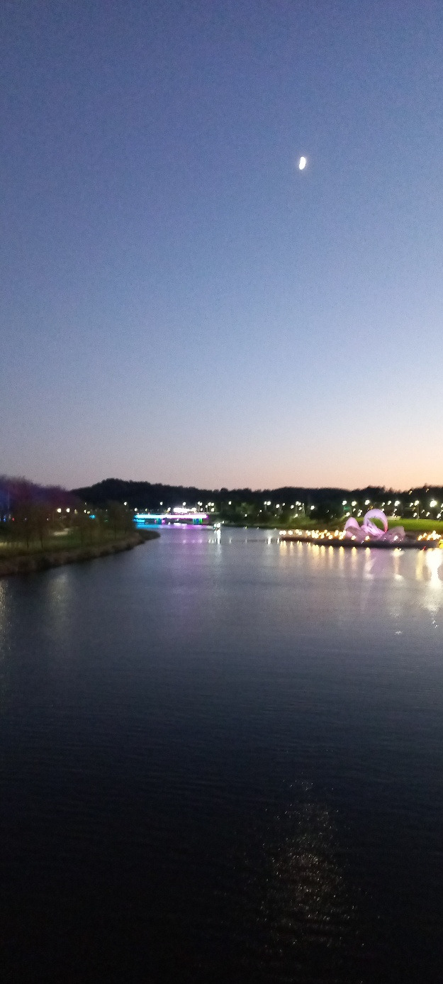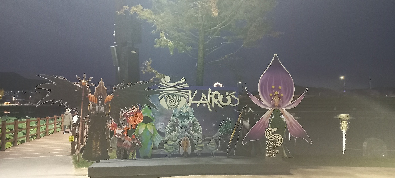 분수대를 비추는 불빛 조명이 물줄기를 비춘다. 연못 위에 동그란 연잎이 떠있다. 2023 순천만 국제정원박람회 상징물 KALROS옆에 검은 두루미 짱뚱어등이 형상화되어 있다. 멀리 둥근 푸른 동산이 보인다. 그 동산과 동천사이에 저녁 7시부터 시작되는 공연을 보기 위해 수많은 관객들이 잔디밭에 자리를 펴고 앉아 있다.