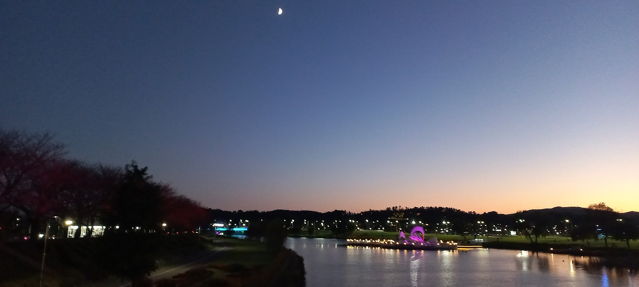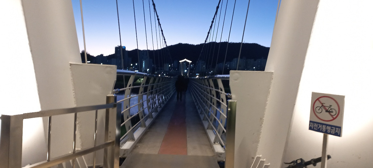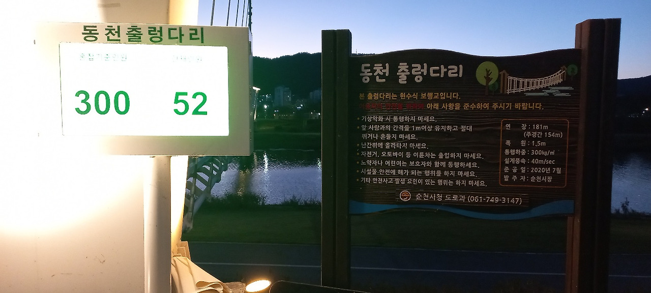 현수식 보행교인 동천 출렁다리를 건너 ’ 오천 그린 광장’으로 넘어갔다. 안전을 위하여 출렁다리 위의 현재 인원을 보여 준다. 300명의 무게를 견딜 수 있는 다리 위에 현재 52명이 통과 중이라는 화면이 보인다. 해가 넘어가고 동천 위에 달이 걸려있다. 물 위의 불빛이 장관이다.