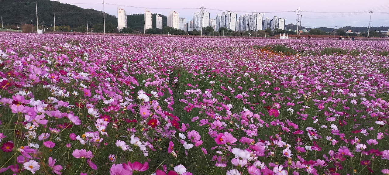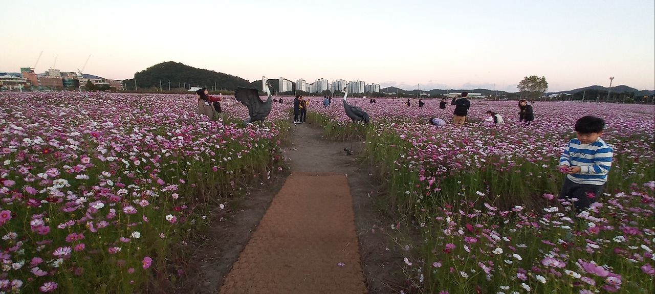 어릴 적 학교 통학 오리길 길가에 피어 있던 코스모스 생각이 저절로 났다. 어마어마한 규모다. 가족, 연인들이 아쉬운 시간을 담아내느라 바쁘다.