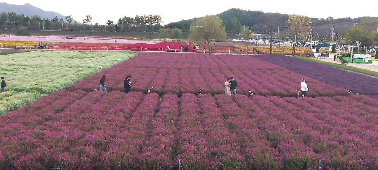광활한 지역에 은은한 보랏빛의 라벤더 꽃밭과 수백만 송이 흰색 분홍색 빨간색 코스모스가 장관을 이룬다.