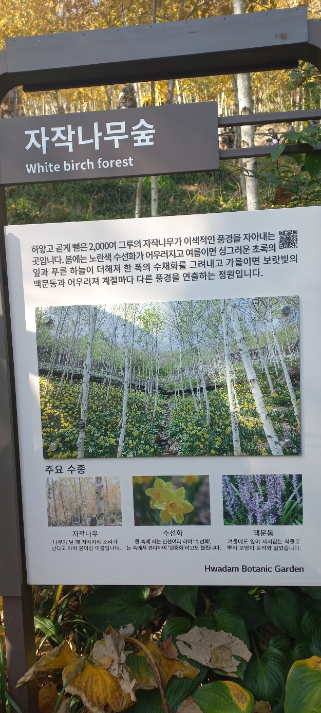 하얗고 곧게 뻗은 2,000여 그루의 자작나무가 이색적이다. 봄에는 노란색 수선화가, 여름이면 싱그러운 신록이, 가을이면 보랏빛의 맥문동과 잘 어우러진다. 나무가 탈 때 자작자작 소리가 난다고 하여 붙여진 이름이다. 자일리톨 껌의 원료로 사용된다.