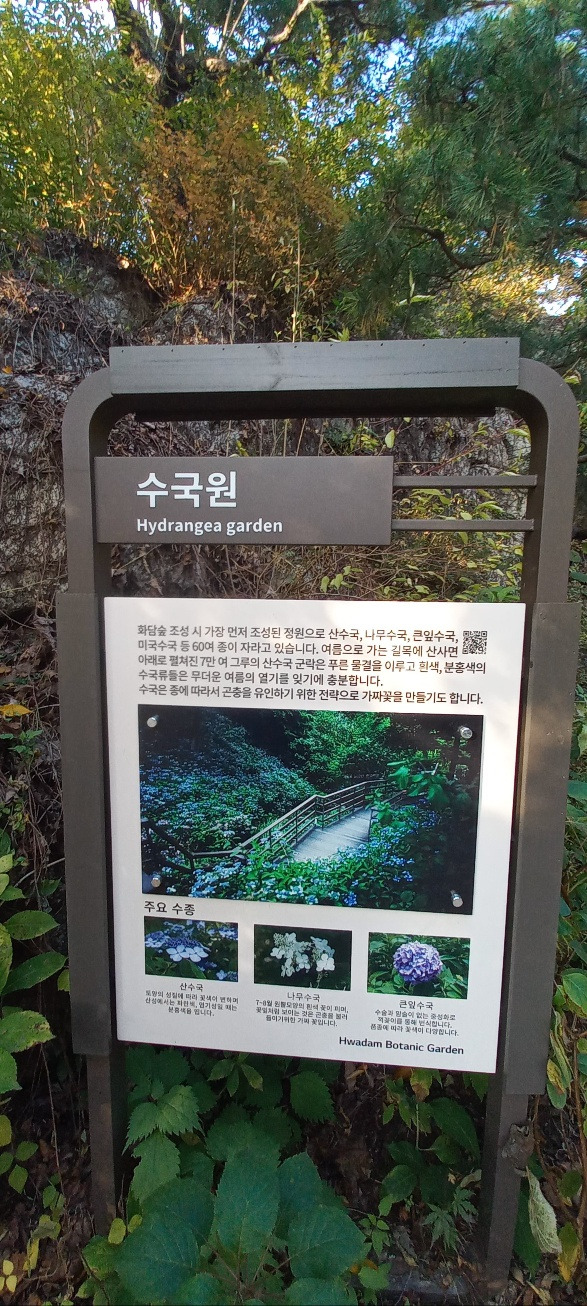 가장 먼저 조성된 정원으로 산수국, 나무수국, 큰잎수국, 미국수국 등 60여 종이 자라고 있다. 초여름에 7만여 그루의 산수국군락이 푸른 잎과 함께 흰색 분홍색 물결을 이룬다. 수국은 땅의 성질에 따라서 꽃색이 변하는데 산성 땅에서는 파란색, 염기성 땅일 때는 분홍색을 띤다.