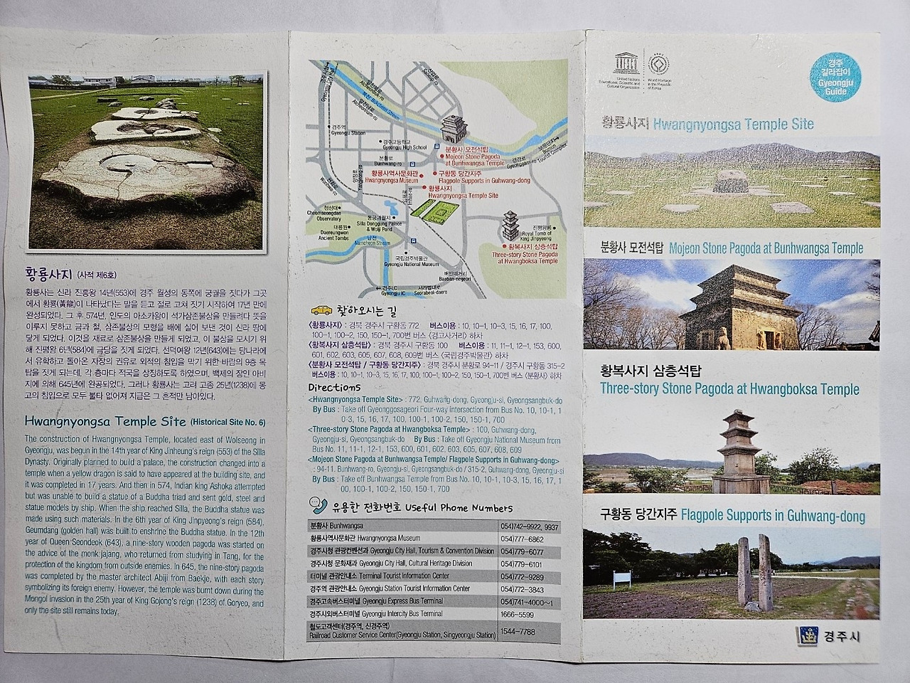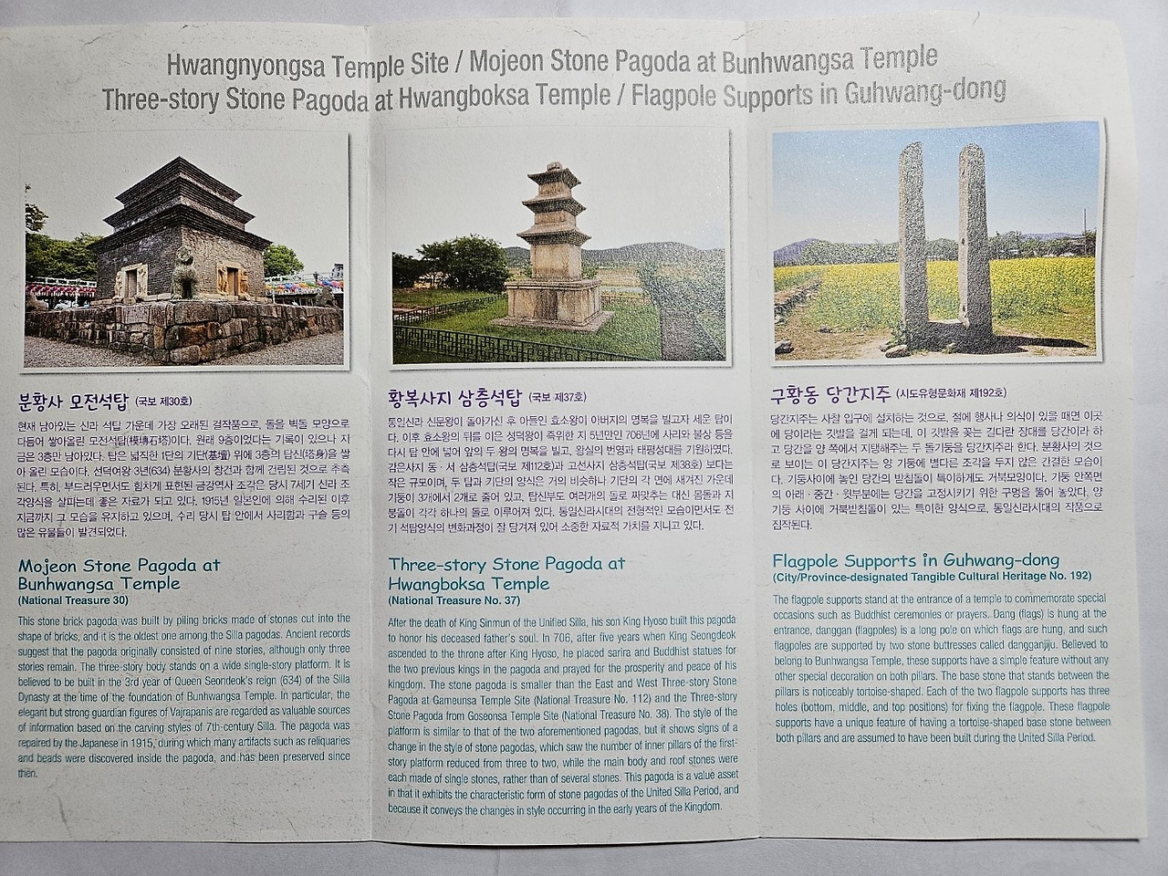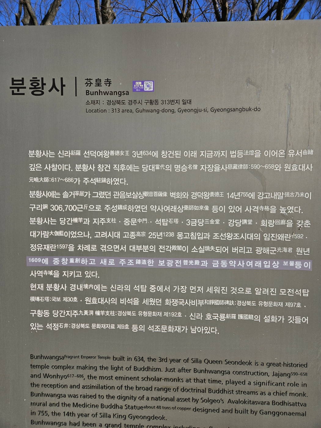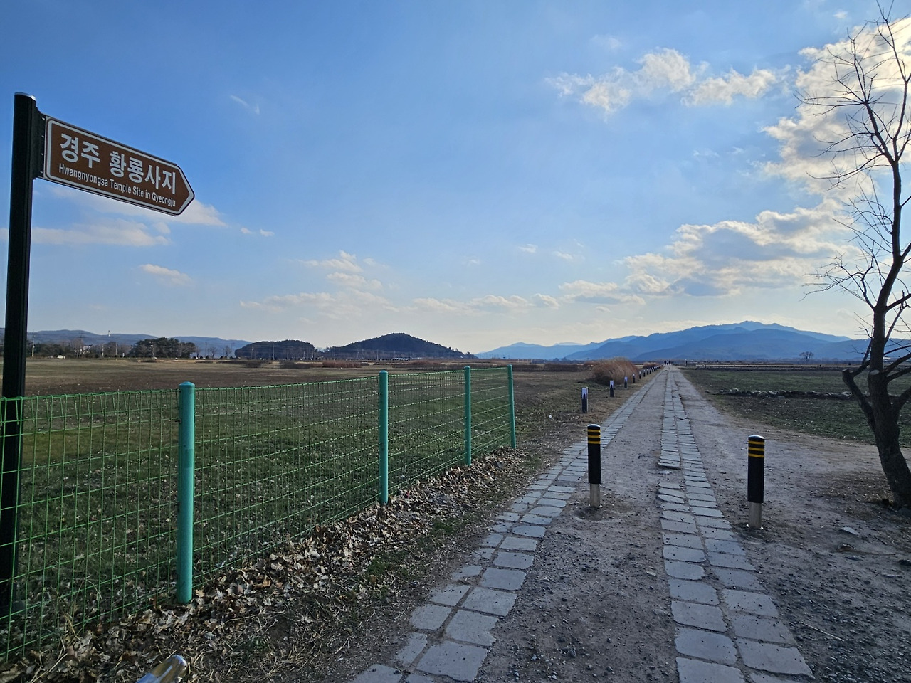 특히 이곳에는 외세(당나라, 몽고, 왜란, 일제)가 할퀸 아픈 역사가 숨겨져 있다. 몽골침입과 임진왜란으로 분황사와 황룡사의 사찰 건물이 불타고 파괴되었다. 그중에서 황룡사는 신라의 대사찰이었으나, 지금은 광활한 대지위에 받침돌만 몇 개 남아 그 위치와 흔적만 추측할 뿐이다. 그 이름도 그냥 황룡사지터다. 건축물이 없기 때문이다. 벌판 한가운데에 있었던 80m 높이 구층탑은 흔적도 없이 사라지고, 겨울 북풍 찬바람만 휑하니 불고 있었다.