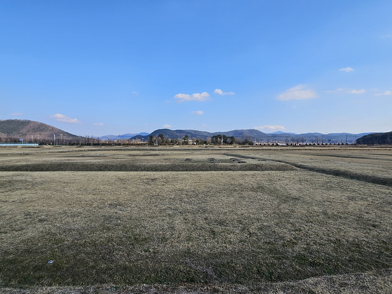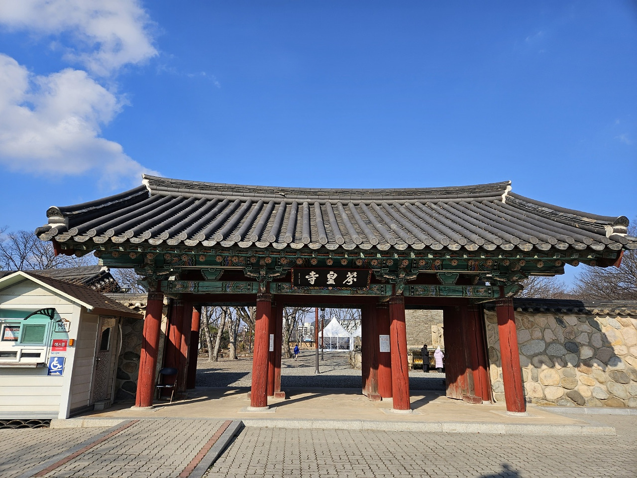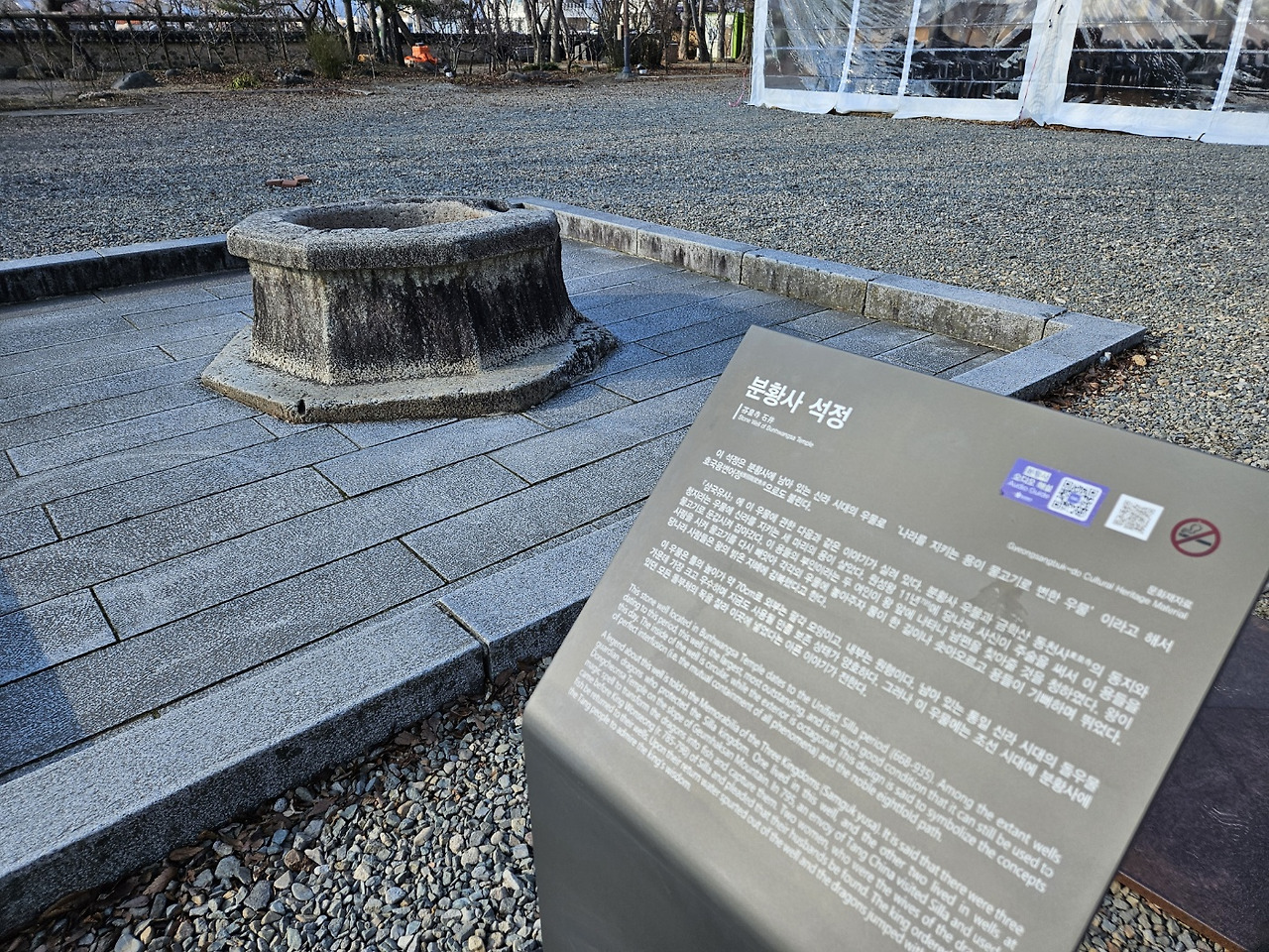 불국사 탐방 후 주차장과 야외 각종 먹거리와 기념품 판매대를 지나 5분 정도 걸어서 내려왔다. 대로에서 그 길 건너편 버스정류장에서 11번을 타고 8번째 정류장(분황사/경고사거리)에서 내렸다. 분황사 표시석이 있는 주차장에서 바라보면 좌측에 분황사, 우측에 황룡사지터가 보인다.
