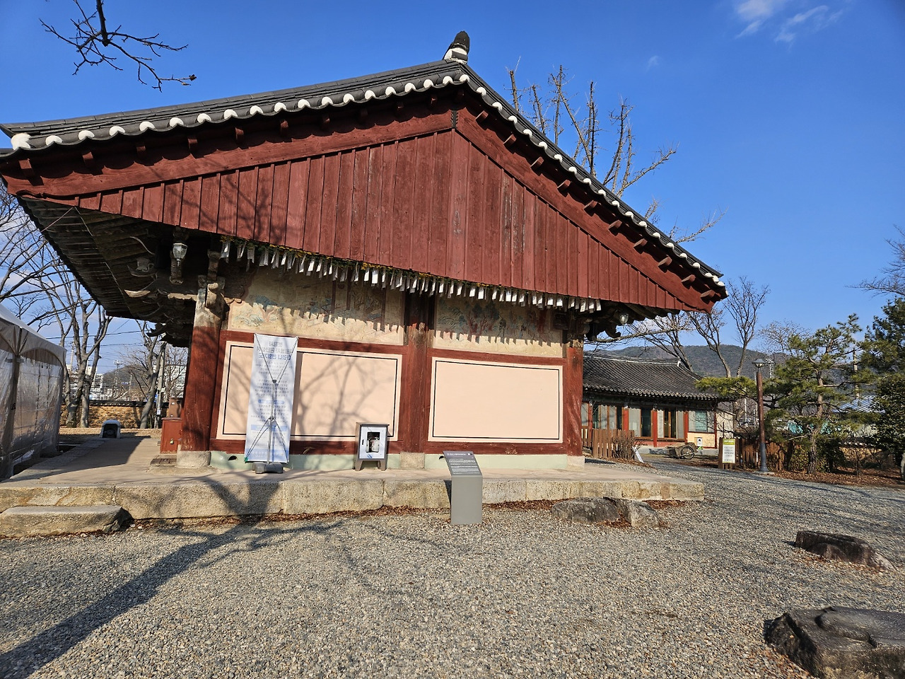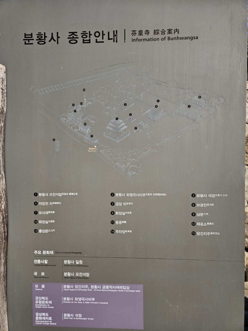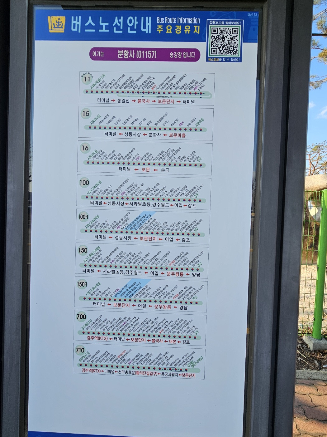 불국사 탐방 후 주차장과 야외 각종 먹거리와 기념품 판매대를 지나 5분 정도 걸어서 내려왔다. 대로에서 그 길 건너편 버스정류장에서 11번을 타고 8번째 정류장(분황사/경고사거리)에서 내렸다. 분황사 표시석이 있는 주차장에서 바라보면 좌측에 분황사, 우측에 황룡사지터가 보인다.