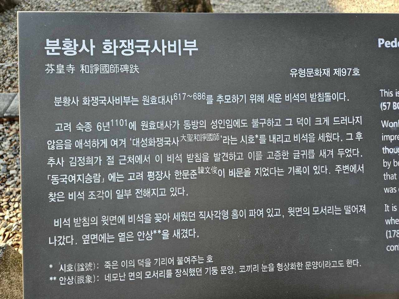 화쟁국사비부는 원효대사를 추모하기 위해 세운 비석의 받침돌이다. 고려 숙종(1101년)은 원효대사에게 '대성화쟁국사'라는 시호를 내리고 비석을 세웠다. 지금은 받침돌만 남아 흔적을 전해 주고 있다.