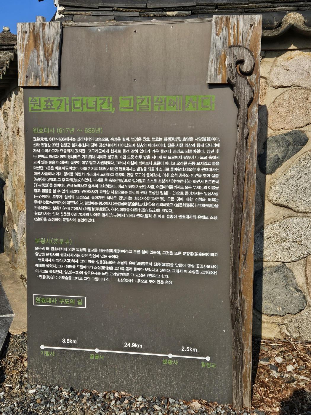 거지행세를 하며 거리에서 노래하고 춤추며 민중포교에 들어갔다. 원효대사가 창시한 독창적인 불교를 분황종 혹은 해동종이라고 불렀다. 분황사에서 화엄경을 지었다. 설총이 그의 아들이다. 분황사앞길(기림사~골굴사~분황사~월정교, 약 30km)을 '원효대사 구도의 길'이라고 부르고 있다.