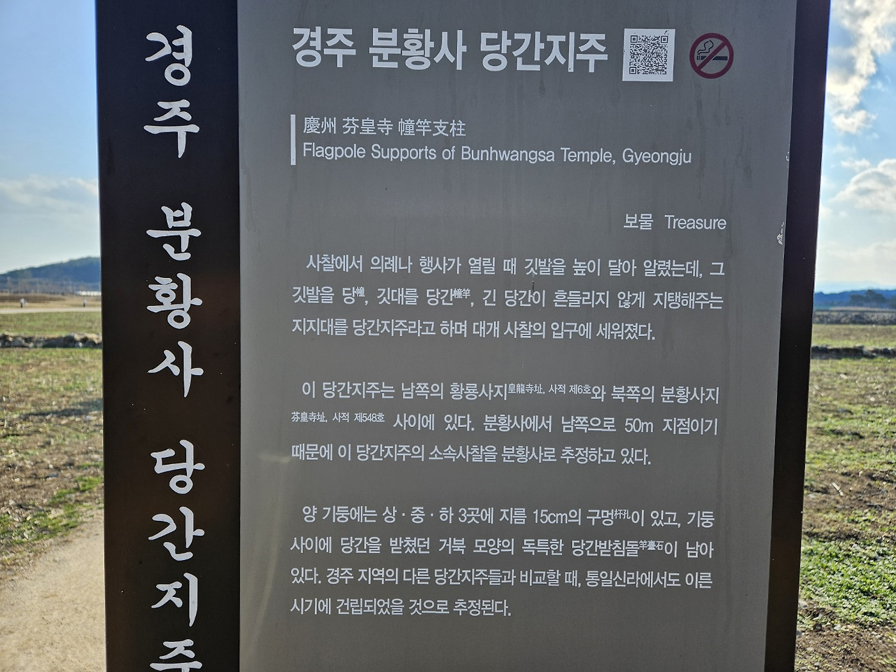 구황동 당간지주는 분황사 일주문 남쪽 50m 지점과 황룡사지 사이에 있다. 사찰에서 의례나 행사가 열릴 때 깃발을 높이 달아 알렸다. 그 깃발을 당, 깃대를 당간, 긴 당간이 흔들리지 않게 지탱해 주는 지지대를 당간지주라고 하며, 대개 사찰 입구에 세웠다. 양 기둥에는 상 중 하 3곳에 지름 15cm의 구멍이 있고, 당간을 받쳤던 거북모양의 당간받침돌이 남아 있다.