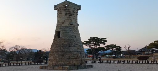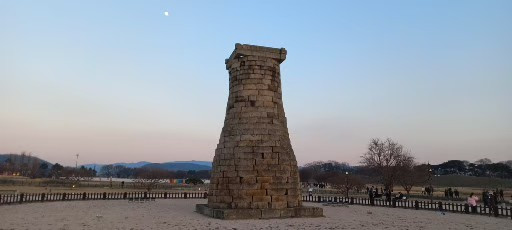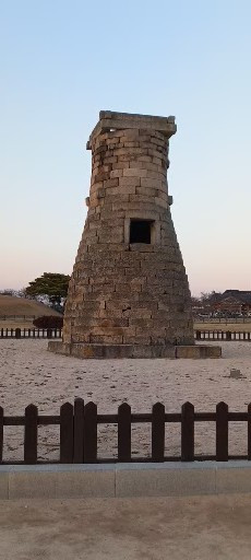 마침내 드디어 경주의 심벌, 첨성대에 도착하였다. 신라 제27대 선덕여왕(632~47년) 때 건립된 현존하는 세계에서 가장 오래된 천문대이며, 당시의 높은 과학 수준을 보여 준다. 받침대 역할을 하는 기단부(基壇部) 위에 술병 모양의 원통부(圓筒部)를 올리고 맨 위에 정(井) 자형의 정상부(頂上部)를 얹은 모습으로 높이는 약 9m이다.