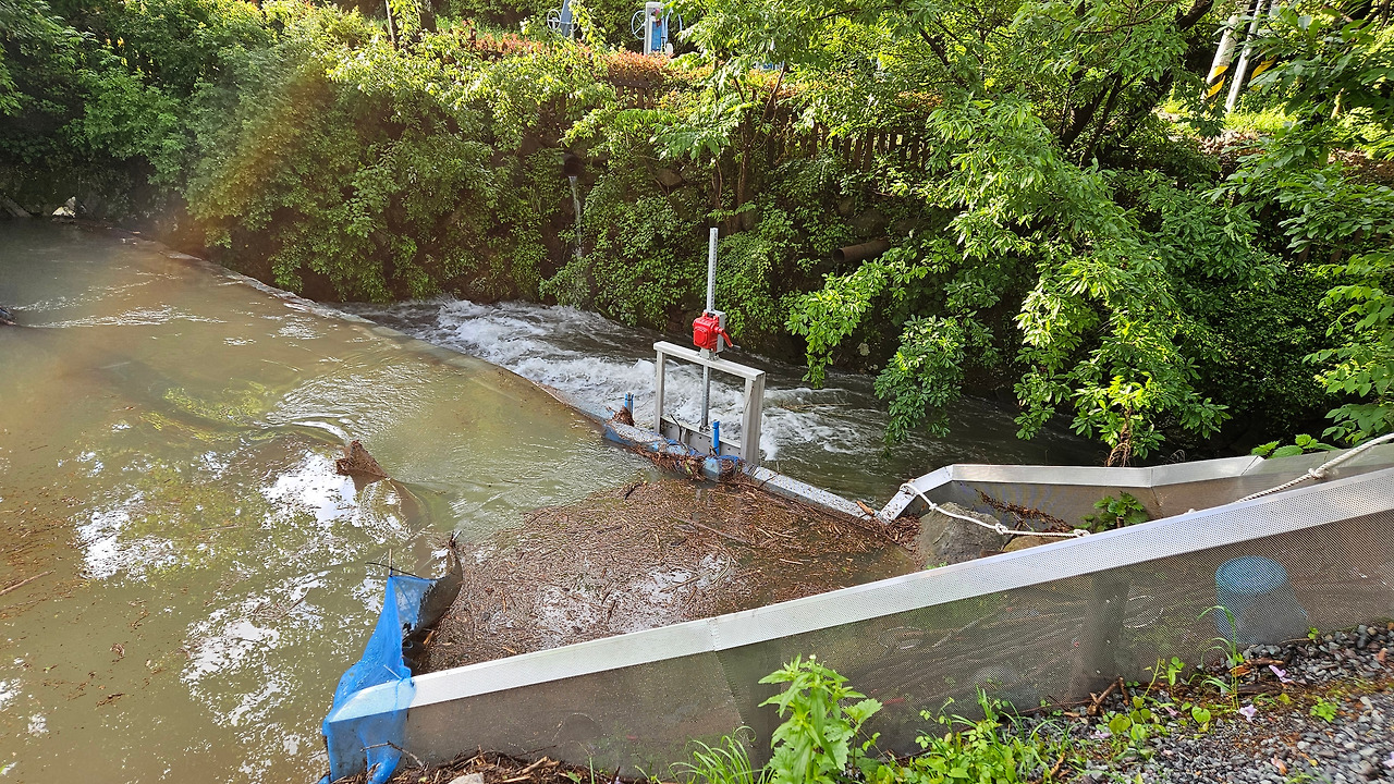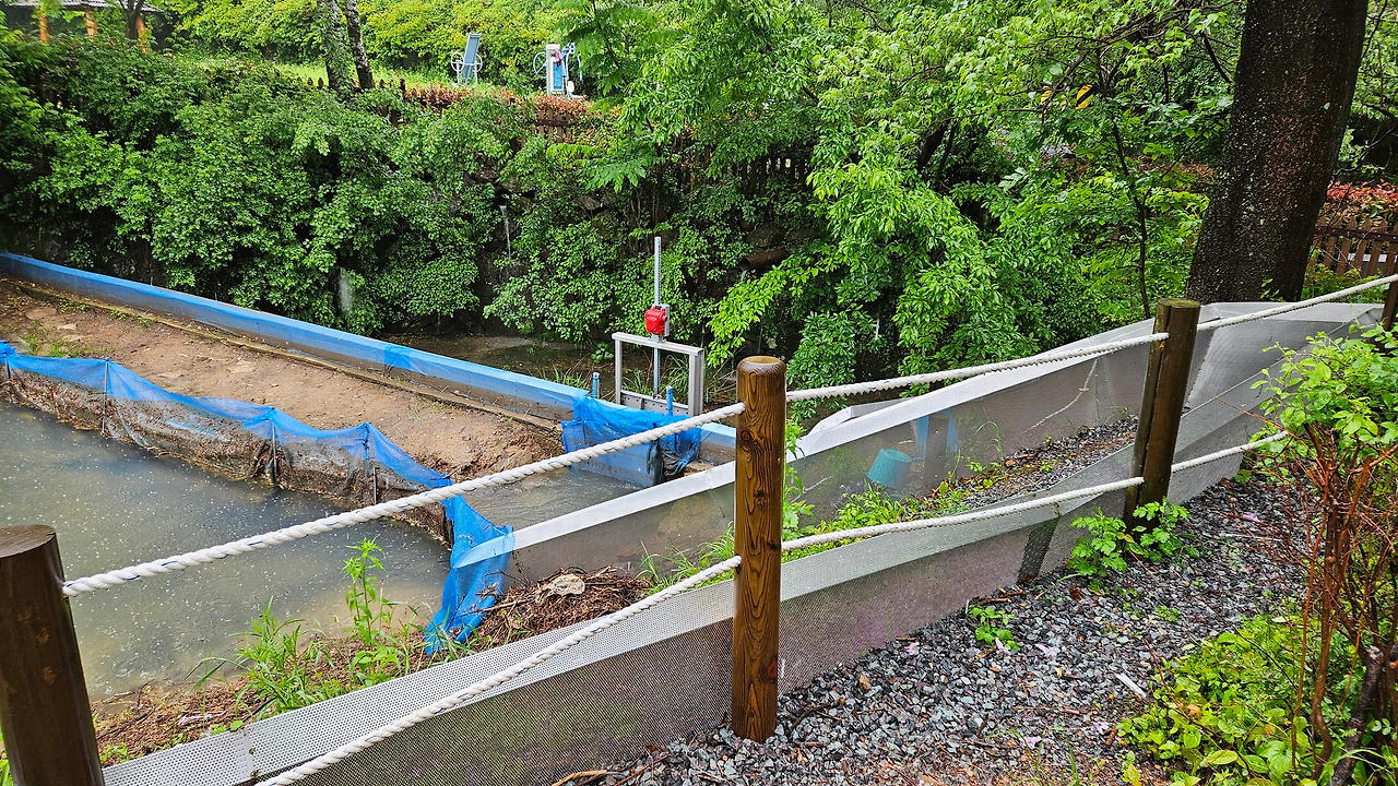 아니나 다를까, 멀리서 봐도 이미 수문에는 물이 흘러넘쳐 폭포가 되어 버렸다. 그때 어제 만났던 그 자원봉사자분이 슬픈 표정을 짓고 뜰채를 손에 들고 멍하니 서있었다. 그러나 철 모르는 아기들은 즐거운 듯이 마지막 여행을 줄줄이 떠나고 있었다.