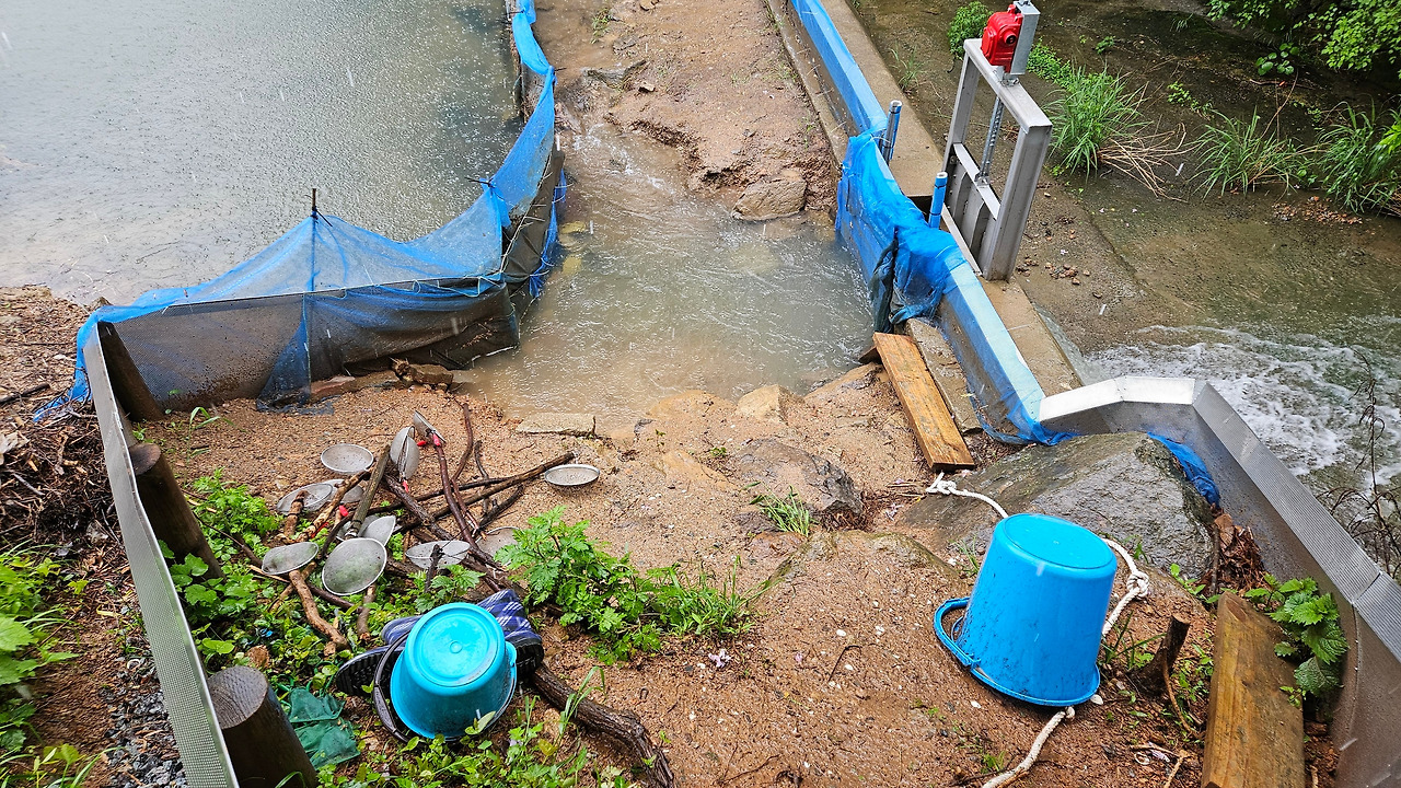 일기예보대로 간밤에 돌풍을 동반한 폭우가 쏟아졌다. 아침 일찍, 당연히 철 모르는 아기 올챙이들이 걱정이 되어 견딜 수 없었다. 저수지 수문으로 달려가 보았다.