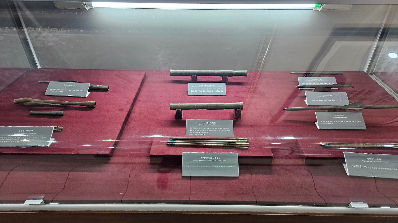 각궁은 물소 뿔, 소힘줄, 뽕나무를 붙여 만들었다. 가볍고 탄력이 좋아 200보 날아간다. 수노는 틀을 만들어 방아쇠를 당겨 화살을 강력하고 정확하게 화살을 쏘는 무기다.