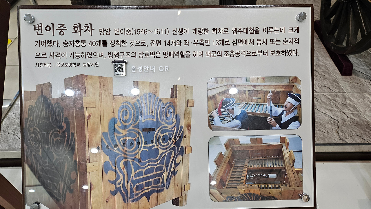 화차, 총통, 신기전 등 최첨단 무기가 있다. 대첩 그림 3점, 대첩비문 병풍, 망암 변이중 선생 문집, 토성에서 출토된 삼국시대 토기와 기와 등 유물이 전시되어 있다.