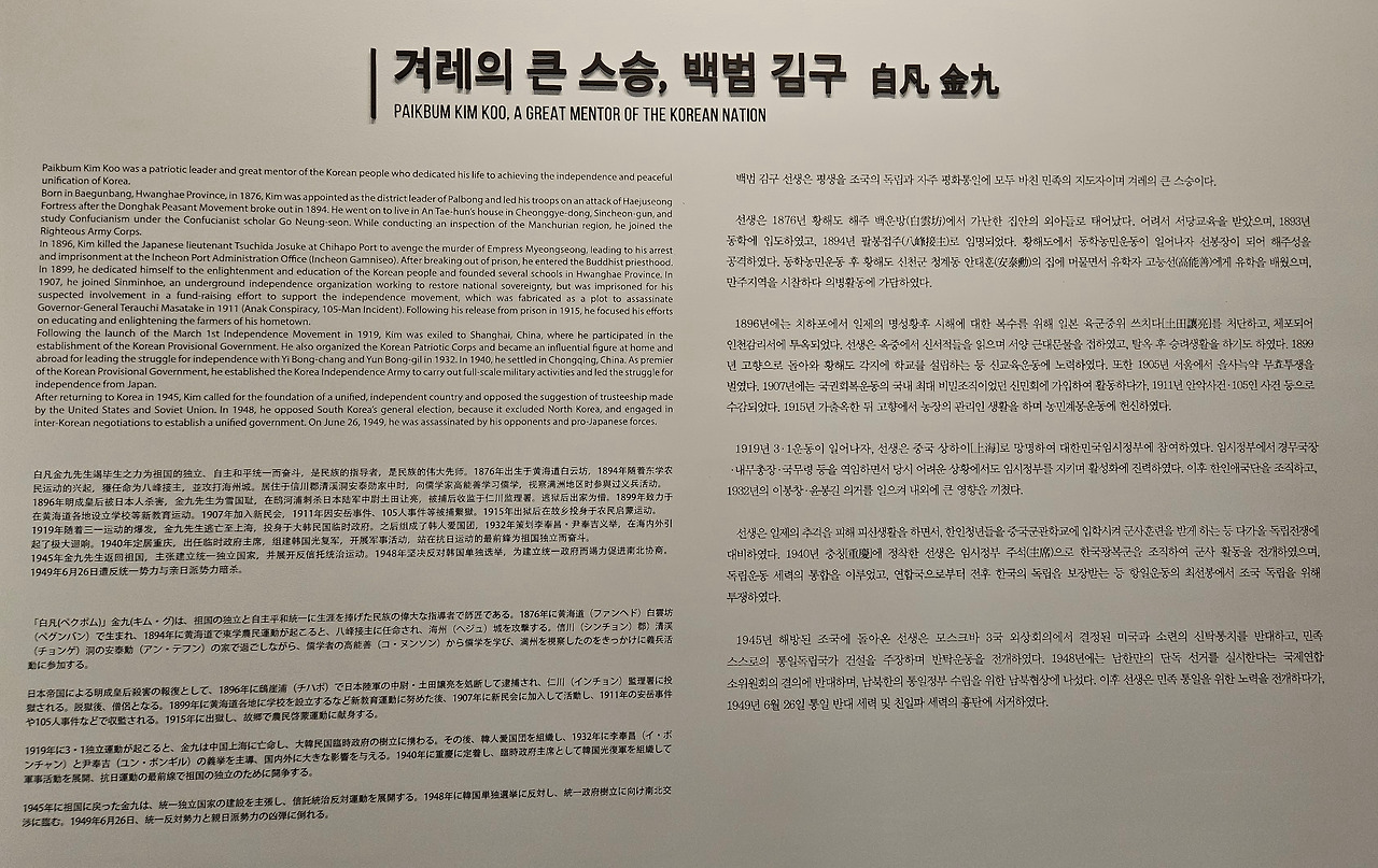 세계에서 가장 아름답고 높은 문화를 가진 자주, 민주, 통일조국을 건설하기 위해 일생을 바친 백범 김구 선생(1876~1949)의 삶과 사상을 알리고 계승, 발전시키기 위하여 , 2002년 10월 22일 개관하였다. 선생의 삶과 사상을 통하여 근현대사를 이해하고, 분단된 조국의 자주 민주 평화적 통일을 지향하는 겨레의 문화적 삶의 공간이다. 백범의 일대기와 역사적 사건이 전시되어 있다.