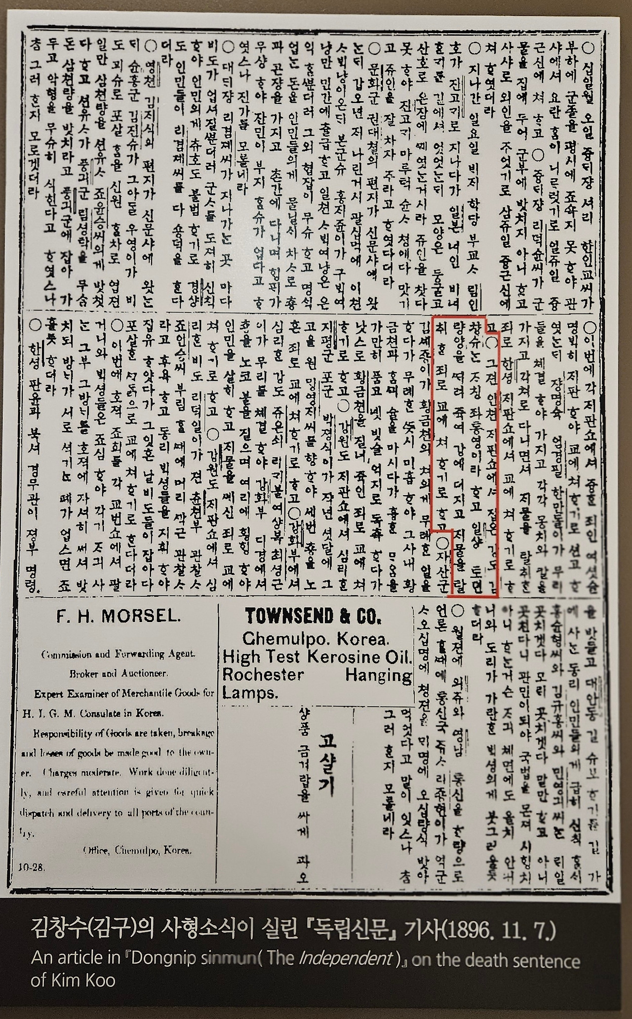 김구의 사형 소식 (1896.11.07, 독립신문, 붉은 선안)