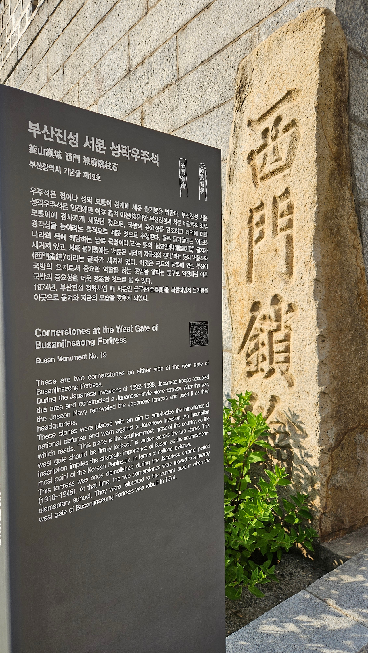 임진왜란 후 이 성을 다시 쌓으면서 왜적에 대한 경각심을 높이고자 새겼다. 즉 이곳을 잃게 되면 나라를 잃게 되고, 여기가 열리면 도적이 창고를 연 것과 같이 된다는 뜻으로, 이 지역이 지니고 있는 국방상의 중요성을 나타냈다. 이 돌은 부산진지성의 원래의 서문터였던 지금의 성남초등학교(증산왜성과 부산진성 중간지점 위치) 교정에 있었는데 1975년 서문인 금루관(金壘關)을 복원하면서 돌기둥을 이곳으로 옮겨와 지금의 모습을 갖추게 되었다