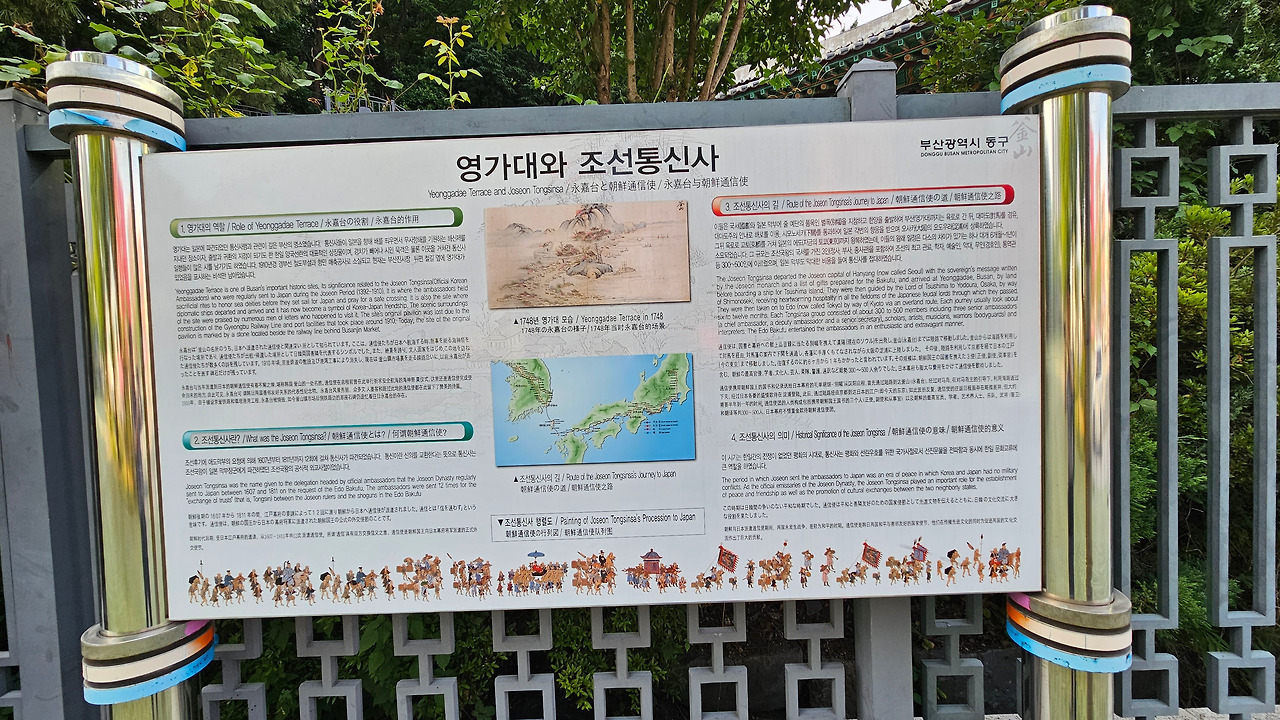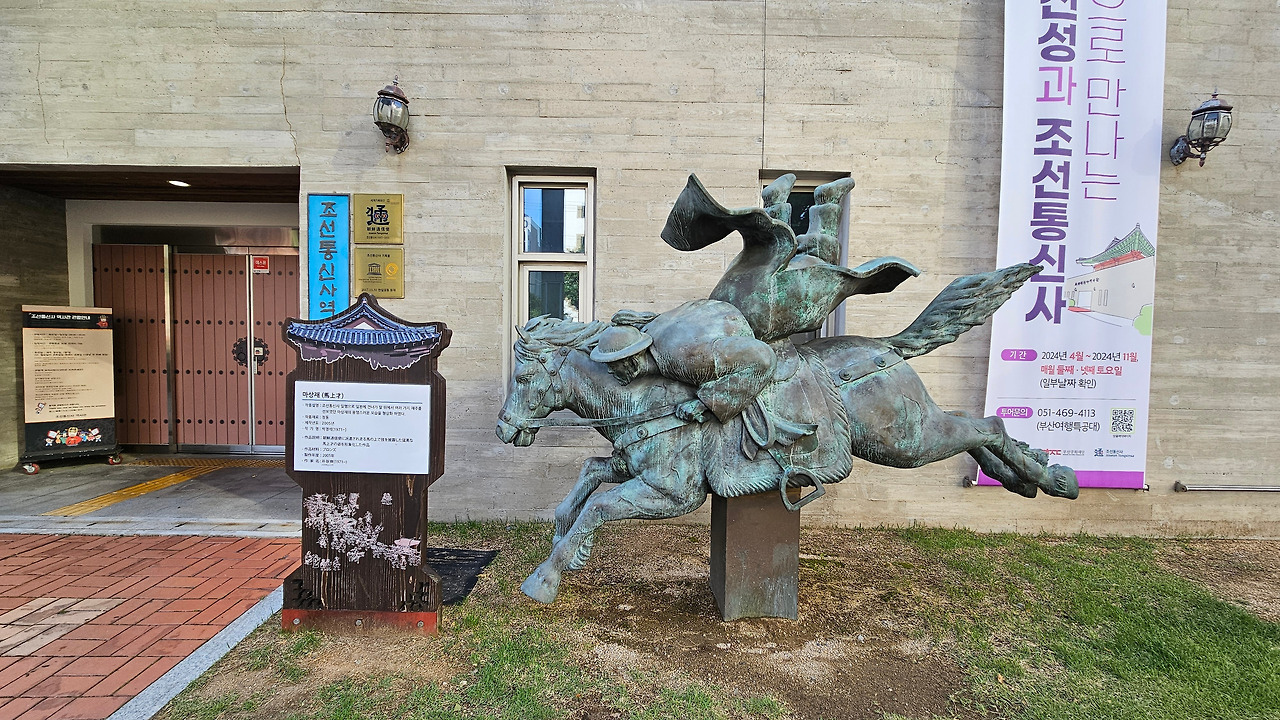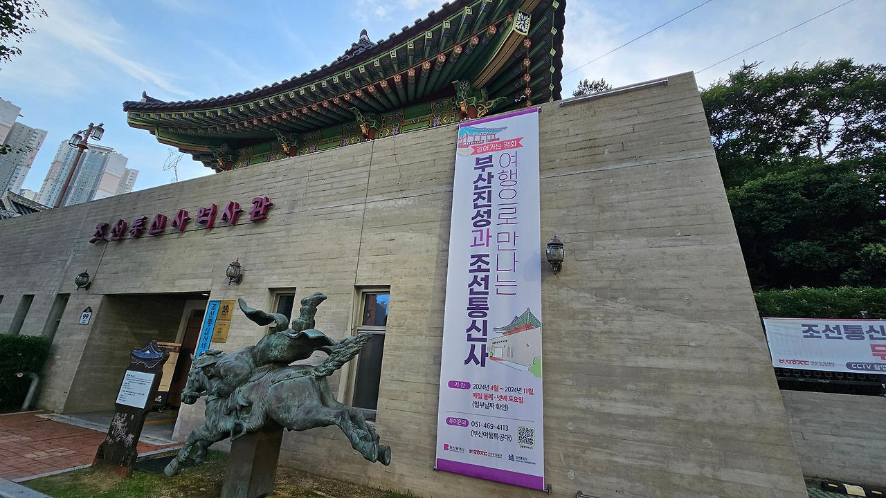 2층 건물 안팎에 상설 전시실, 3D 영상 홍보관, 행사 마당 등의 시설이 있다. 1층에는 조선통신사의 역사적 이해를 목적으로 제작된 영상을 보여주는 3D 영상 홍보관, 전시 공간등으로 구성되어 있다. 2층에는 조선통신사가 오갔던 행로를 알 수 있는 지도와 모형, 통신사 일행이 타고 같던 배의 모형 등이 전시되어 있다. 일본 에도성(江戶城)에 들어가는 통신사 행렬을 재현한 영상이 상영되고 있다. 자성대 공원 내 영가대(永嘉臺) 옆에 건립하였다.