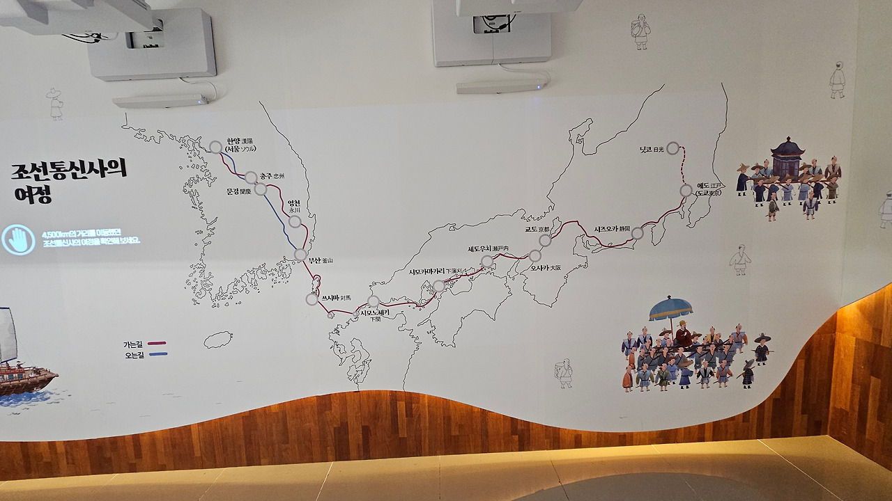 조선통신사의 이동 경로는 한양→부산→대마도→시모노세키→오사카→교토→에도(도쿄)로 이어졌다. 한 번 왕래하는 데 6개월~1년이 걸렸다. 통신사 사절단 규모는 정사, 부사, 종사관, 학자, 예술인, 악대, 경호원, 통역관 등 300~500명에 이르렀다.