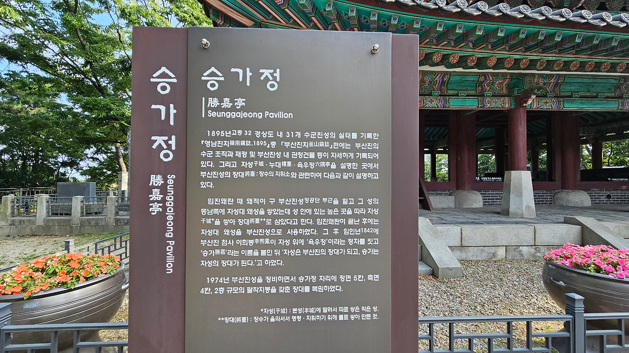 영남진지는 승가정에 대해 다음과 같이 기록해 놓았다. "정자(亭子)는 부산의 자성(子城)에 있다. 산이 마치 엎어놓은 가마(釜)와 같다 하여 부산(釜山)이라 한다. 그 지형을 따라 돌을 쌓은 것이 성의 형상과 같기 때문에 자성(子城)이라 한다. 승가(勝嘉)의 뜻은 좋은 땅으로 인해 아름다운 정자를 짓는다는 데 있다. 영가대(永嘉臺)는 물가에 있고 승가정(勝嘉亭)은 산의 꼭대기에 있다. 이 정자에 오르면 평평하고 대해(大海)를 굽어보고 대마도(對馬島)를 바로 바라볼 수 있다."
