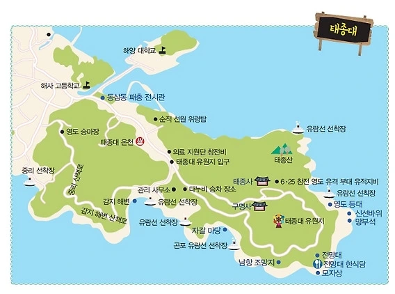 태종대는 1,632,809㎡ 면적에 해발 250m에, 깎아 세운 듯한 해안 절벽과 푸른 바다가 유명하다. 대한해협을 한눈에 볼 수 있는 명소다. 청명한 날에는 약 56㎞거리인 일본의 쓰시마섬까지 볼 수 있다.