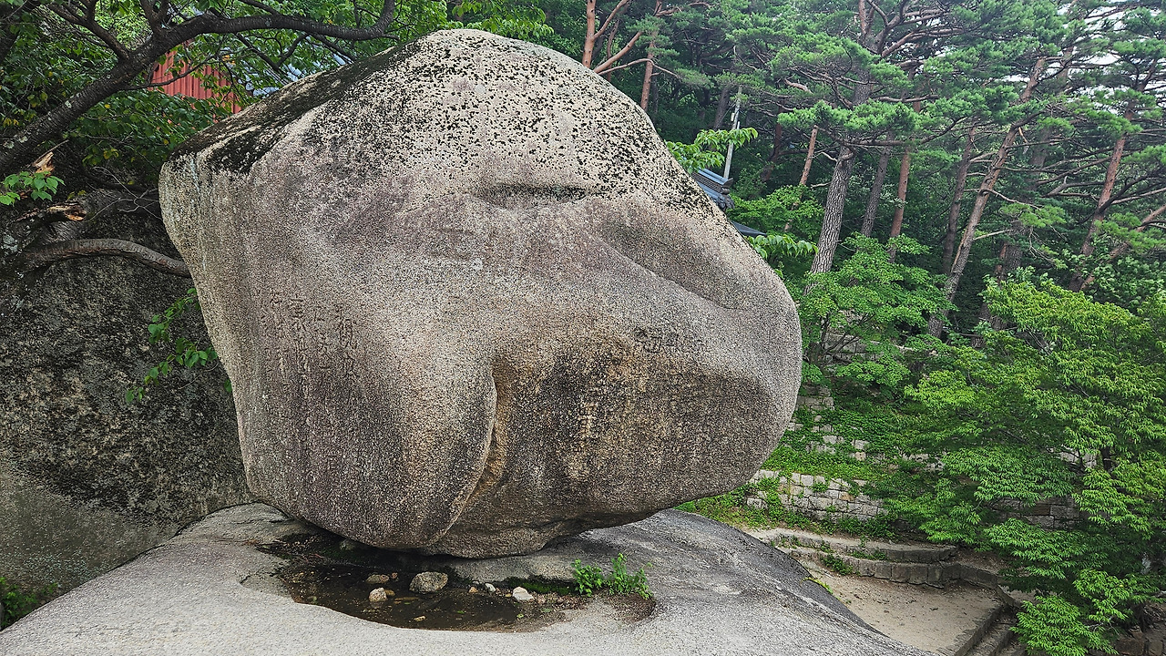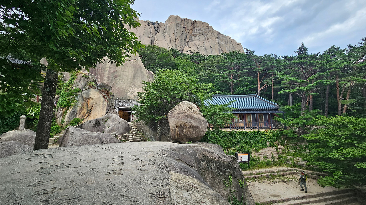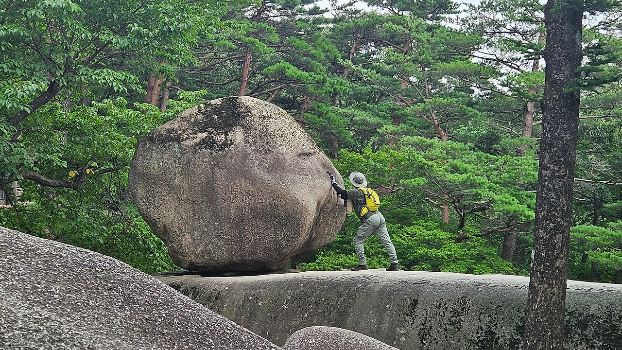 흔들바위 어떤 장정이 힘껏 바위를 몇 차례 밀었다. 유심히 관찰해 보니 조금 흔들렸다. 구조를 좀 더 세심히 살펴보니 바닥의 화강암 암석이 긴 직사각형이고 긴 직사각형의 끝부분이 약간 올라와 있었다. 미는 방향에서 보면 둥근형태의 바위지만, 계조암 석굴 쪽에서 보면 밀 수 있는 공간이 없고 둥근형태가 아니라 사각형 형태였다. 즉, 둥글게 보이는 쪽에서 웬만하게 밀어서는 굴러 떨어지지 않는 모양새다. 그렇지만, 관광객이 바로 밑을 지나가게 되니, 절대 절대 힘자랑하며 밀지 마시라. 설악산에서 흔들바위가 없다면, 무슨 재미로 설악산에 올라가겠는가? 곳곳에 호랑이가 가죽을 남기듯, 이름들이 세겨져 있다.