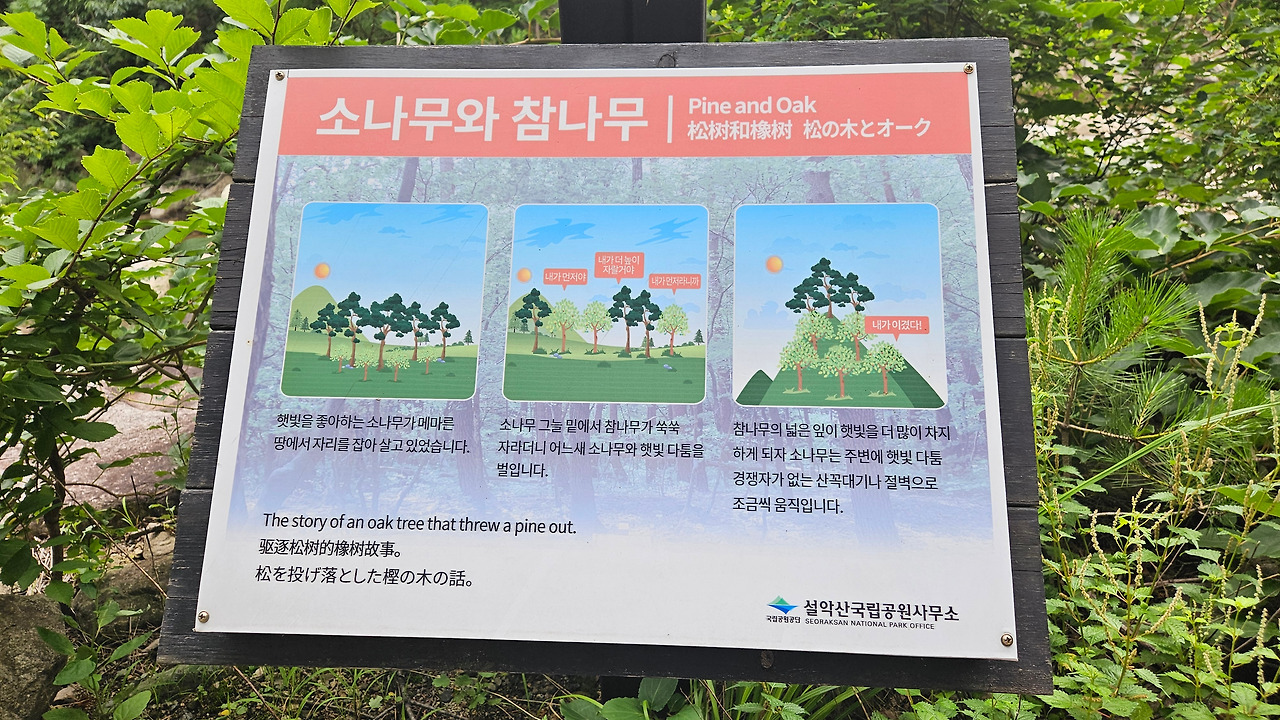 자리다툼에서 밀려 난 소나무 신흥사 입구를 지나 계속 올라가면 군데군데 해당 나무에 대한 설명판이 세워져 있다. 그중 특이한 것은 나무들의 천이 이동 경로인데, 소나무가 참나무 세력에 밀려 산꼭대기나 절벽등으로 이동하였다는 대목이다. 인생에도 가끔 그런 일이 벌어진다. 아프리카 초원에서 하이에나 무리에게 쫓겨나는 수사자와 같은 처지일까?