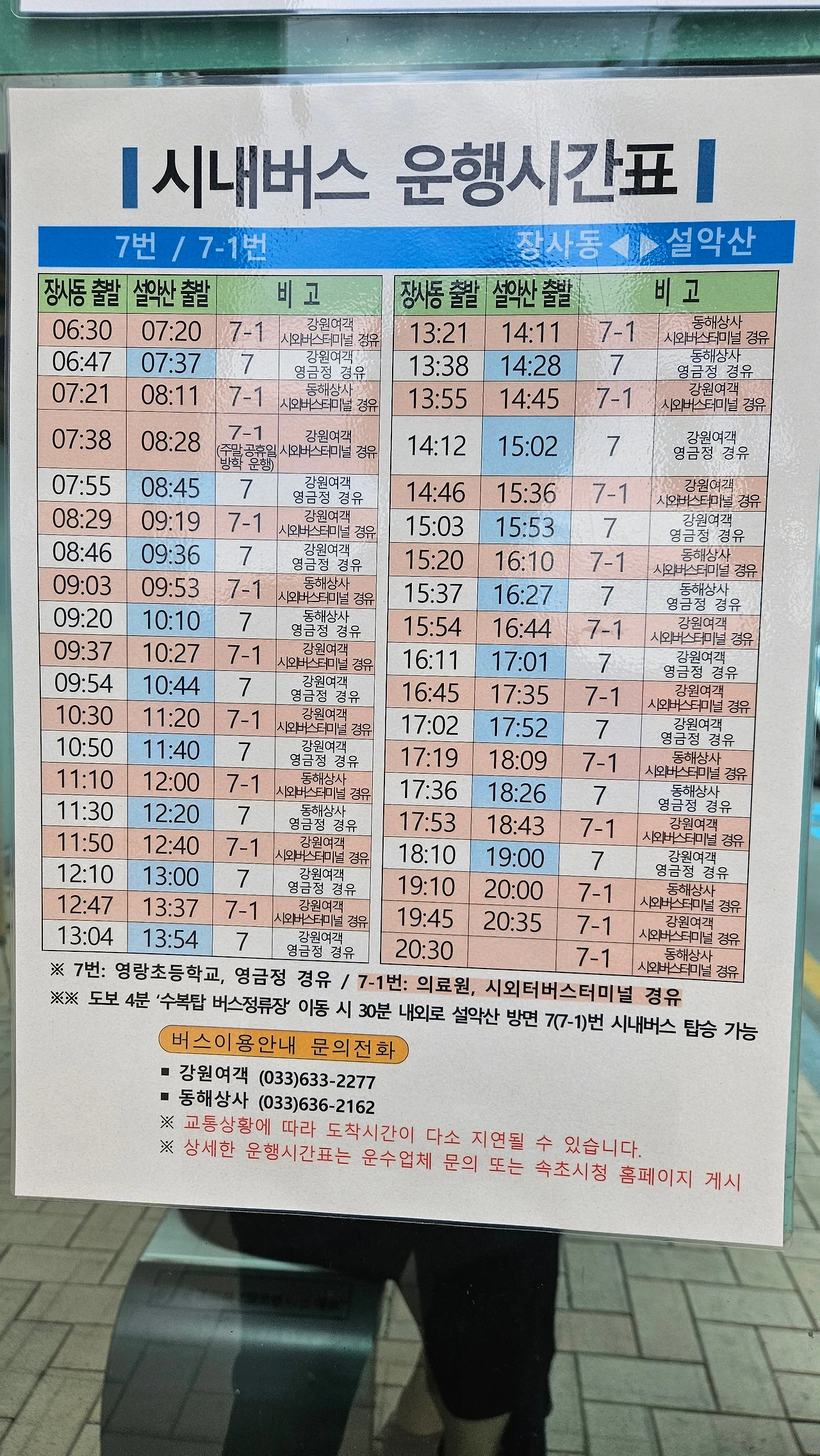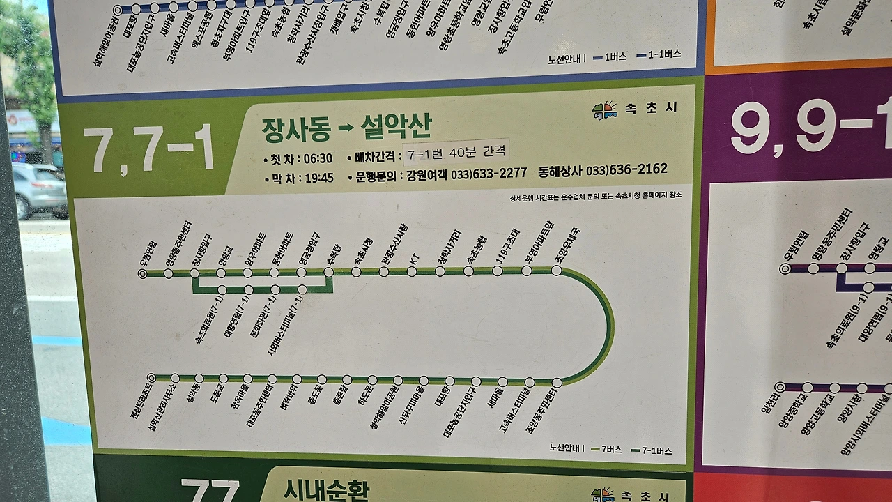 속초 시외버스터미널 정류장에서 출발하는 7-1번 시내버스를 타고 종점인 설악 소공원 버스 정류장에서 내렸다.