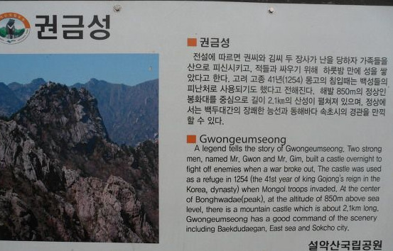 신흥사 경내 탐방 후 소공원 방향으로 내려오다가 보면, 우측에 권금성으로 올라가는 케이블카가 설치되어 있다. 전설에 따르면 권(權)·김(金)의 두 가지 성을 가진 두 장사가 난을 당하자 가족들을 산으로 피신시키고, 적들과 싸우기 위해 하루 만에 쌓은 성이라고 한다.